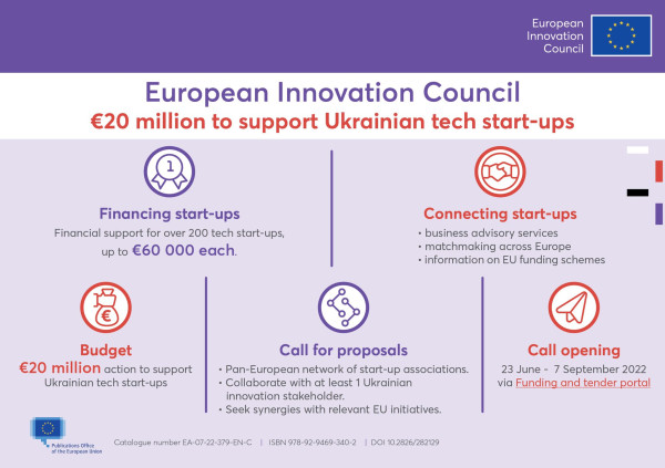 Komisařka Mariya Gabriel oznámila připravovanou výzvu EIC, která by měla podpořit technologické start-upy sídlící na území Ukrajiny nebo nuceně přesídlené mimo Ukrajinu z důvodu vojenského konfliktu vyvolaného Ruskem. Na základě výzvy vznikne podpůrná síť, která nabídne zhruba 200 firmám finanční částku 60 tisíc € na rozvoj podnikání a řadu podpůrných a poradenských služeb. Výzva se otevře 23. června, uzávěrka je plánována na 7. září 2022. Podrobnosti budou dostupné na Funding & Tenders Opportunities portálu v sekci EIC. Informační webinář věnovaný této výzvě se uskuteční 24. června.