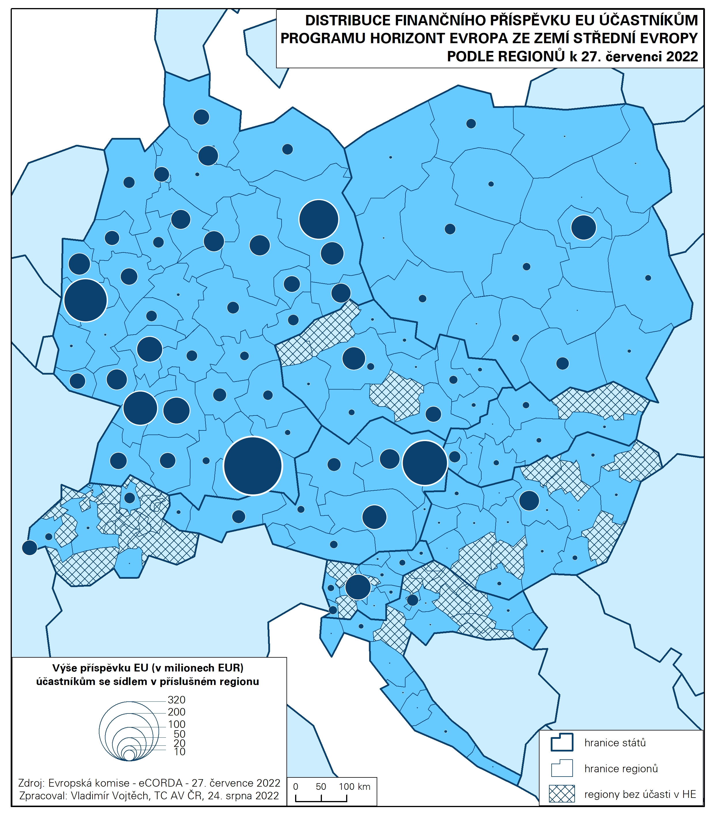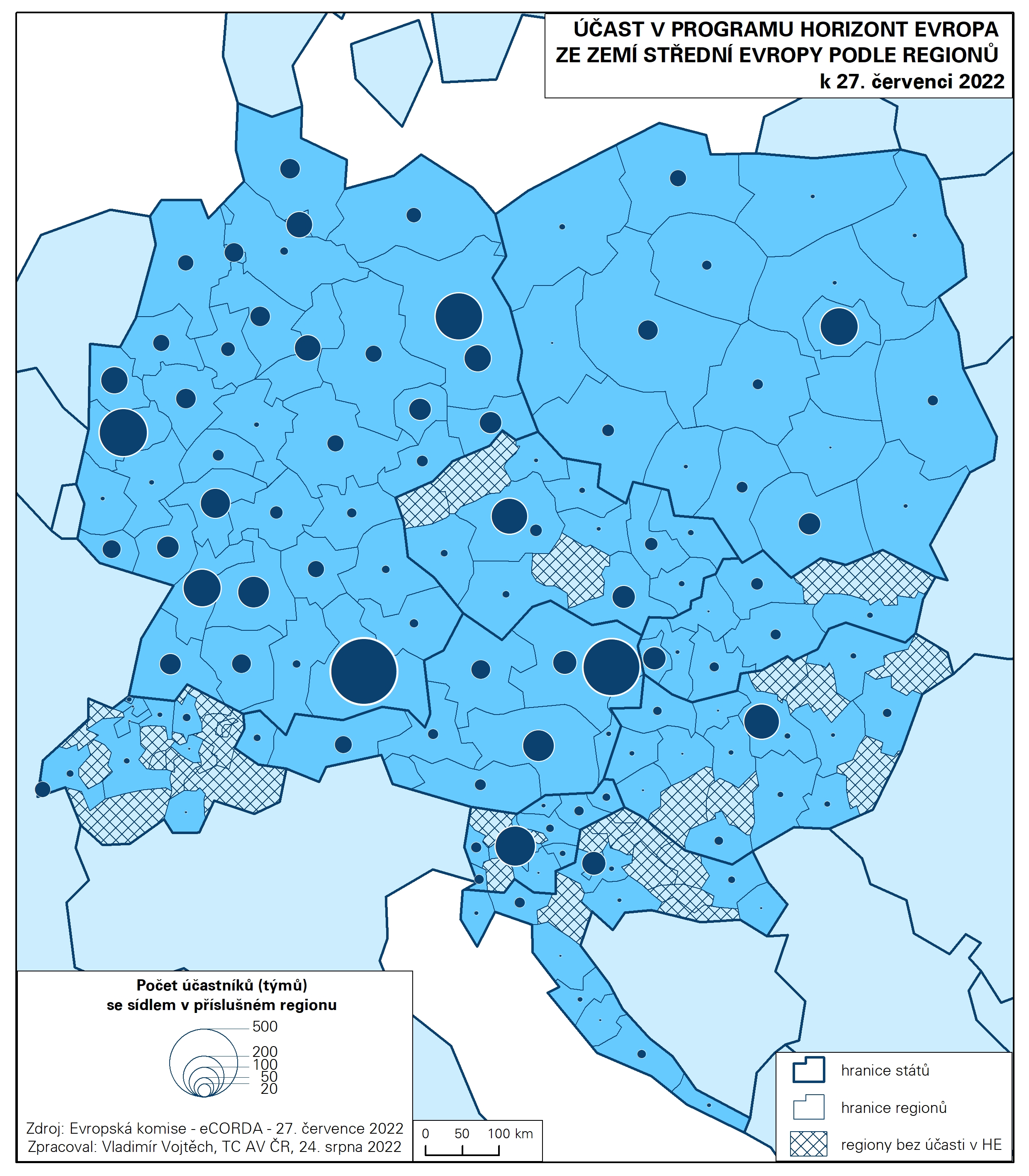 Aktuální databáze eCorda k 27. červenci 2022 – při výběru účastníků typu příjemce (beneficiary) a při výběru statusu projektu jako podepsaného (signed) či v přípravě k podpisu (under preparation) – evidovala následující počty účastí pro středoevropské země: 2 569 účastí pro Německo, 679 pro Rakousko, 400 pro Polsko, 282 pro ČR, 251 pro Slovinsko, 196 pro Maďarsko, 113 pro Chorvatsko, 110 pro Slovensko a 58 pro Švýcarsko, které v současnosti má status neasociované třetí země. Účast subjektů sídlících v krajích ČR se pohybovala od 0 (kraje Karlovarský, Ústecký, Vysočina) po 151 (Praha). Počet účastí subjektů se sídlem v Praze se nemohl rovnat německým metropolitním regionům – vládním krajům Horní Bavory (tj. regionu Mnichova) s 517 účastmi a Kolín nad Rýnem s 275 účastmi (kam patří nejen Kolín, ale i významná univerzitní střediska Cáchy a Bonn) či Berlínu (262 účasti). Na druhé straně počtem účastí Praha překonala např. Hamburk (79 účastí) či vládní kraj Stuttgart (114 účastí). Mezi středoevropskými regiony se umístila na 8. místě. V rámci nových členských zemí je ale v programu HE Praha překonávána středním Slovinskem (Lublaní; 194 účasti) a regionem Varšavy (164 účasti).