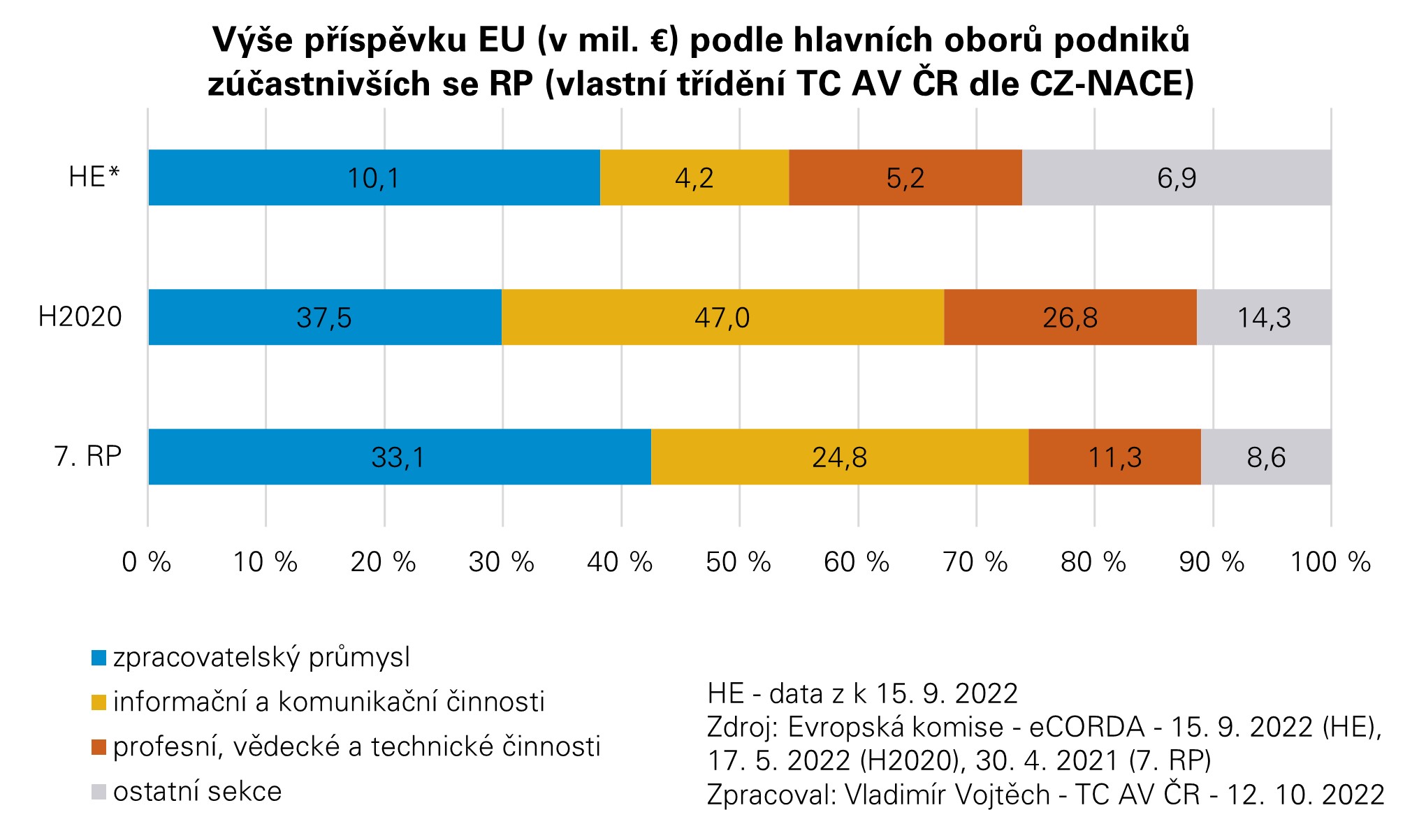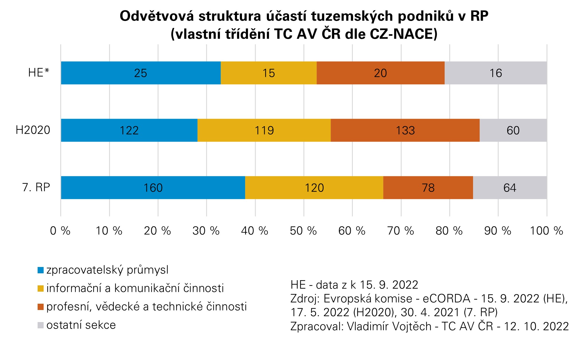 K 15. září 2022 ČR vykázala 76 účastí subjektů s právní formou soukromé ziskové společnosti (dále jen „podniků“) v programu Horizont Evropa. Celková výše příspěvku Evropské unie těmto podnikům činila 26,5 milionů €. Tento údaj zahrnuje pouze účastníky typu „příjemce“ (beneficiary), kteří mají s Evropskou komisí podepsánu grantovou dohodu nebo probíhá příprava k jejímu podpisu. Doposud nebyla podrobně zkoumána oborová struktura podniků, které se zúčastnily rámcových programů EU pro výzkum a inovace. Jako hlavní hledisko byl zvolen obor hlavní činnosti dle odvětvové klasifikace CZ-NACE. Zdroji dat byly nejprve Registr ekonomických subjektů ČSÚ (k 31. květnu 2022) a aktuální snímek databáze MagnusWeb, provozované společností Dun & Bradstreet Czech Republic, a. s. Poněvadž mezi oběma databázemi byly identifikovány jisté rozdíly v uváděných oborech hlavní činnosti podniků zúčastnivších se rámcových programů a zároveň existovaly i rozdíly mezi těmito databázemi a internetovými prezentacemi podniků, přiklonil se autor tohoto příspěvku k vlastnímu přiřazení oborů hlavní činnosti dle kategorizace CZ-NACE právě z podnikových internetových prezentací a výročních zpráv.