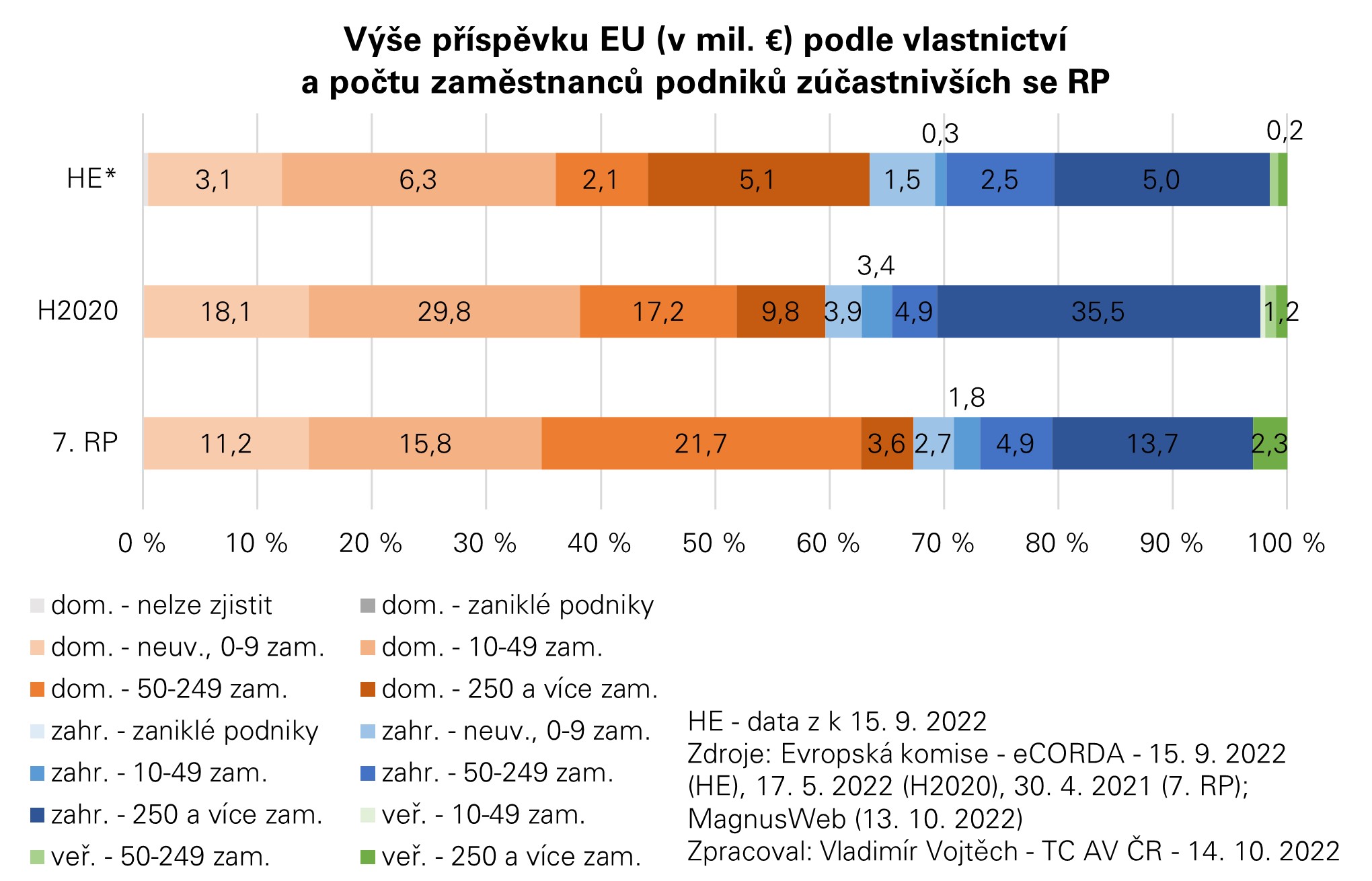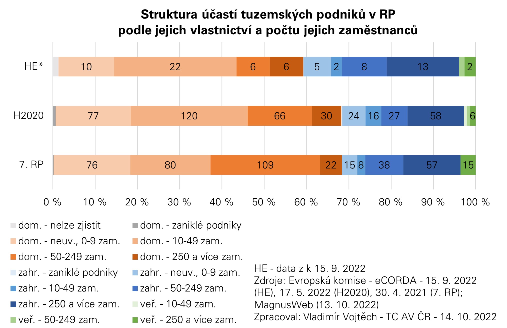 Předchozí příspěvek z 12. října 2022 stručně hodnotil odvětvovou strukturu účasti tuzemských podniků v rámcových programech. Cílem tohoto příspěvku je navázat a představit čtenáři velikostní strukturu těchto podniků podle počtu zaměstnanců. Přidáno je i hledisko institucionálního sektoru neboli vlastnictví, neboť rámcových programů se účastní domácí a zahraniční podniky odlišných velikostních kategorií. Opět jsou hodnoceni pouze účastníci typu „příjemce“ (beneficiary), kteří mají s Evropskou komisí podepsánu grantovou dohodu nebo probíhá příprava k jejímu podpisu. Poněvadž hodnotíme tři po sobě jdoucí rámcové programy, je pro nás rozhodující velikostní kategorie podniku v době ukončení programu. To znamená pro 7. rámcový program rok 2014; pro program Horizont 2020 rok 2020, neboť databáze MagnusWeb, provozovaná společností Dun & Bradstreet Czech Republic, a.s., v době zpracování tohoto příspěvku nedisponuje údaji ze závěrek zúčastnivších se podniků za rok 2021. V případě aktuálního programu Horizont Evropa vycházíme rovněž z údajů pro rok 2020.