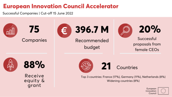Evropská komise zveřejnila výsledky hodnocení uzávěrky programu EIC Accelerator, která proběhla 15. června 2022. Podáno bylo 986 žádostí, z nich 6 bylo z České republiky. Mezi 75 firmami, které prošly tříkolovým hodnocením a byly vybrány k financování, je i český Neuron Soundware. Tato společnost se zabývá diagnostikou možných poruch na výrobních zařízeních s využitím AI a pomáhá tak předcházet závažnějším selháním. Podrobnosti o výsledcích uzávěrky naleznete zde.