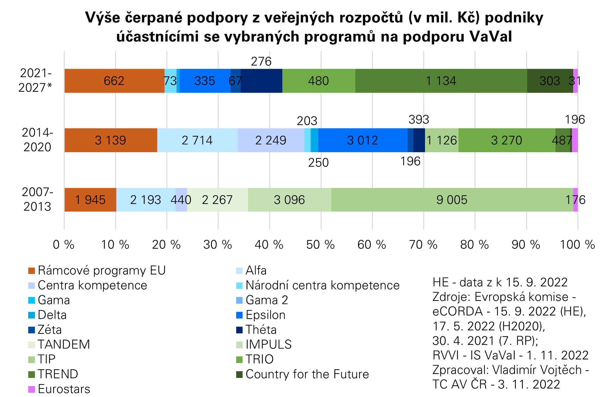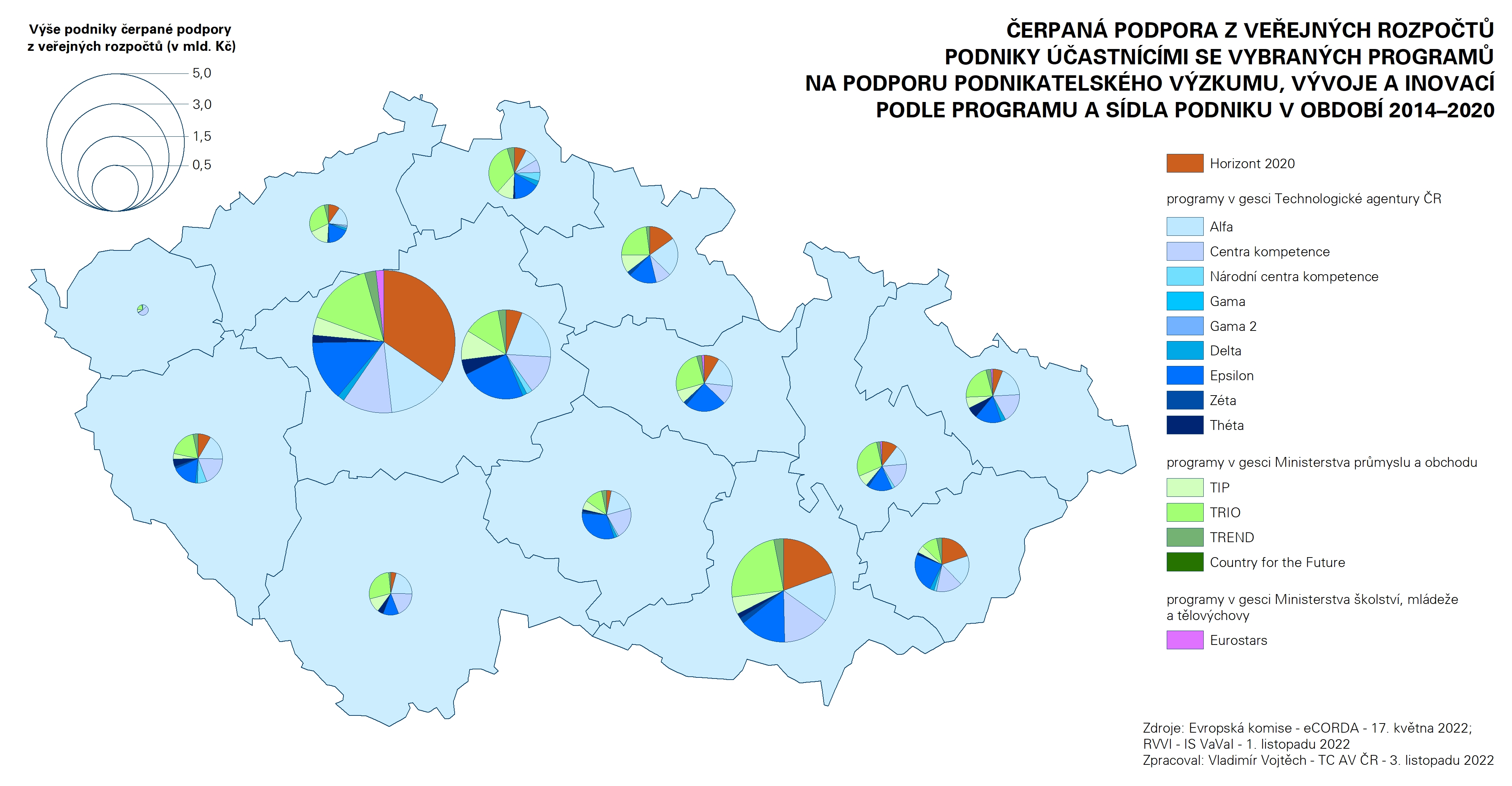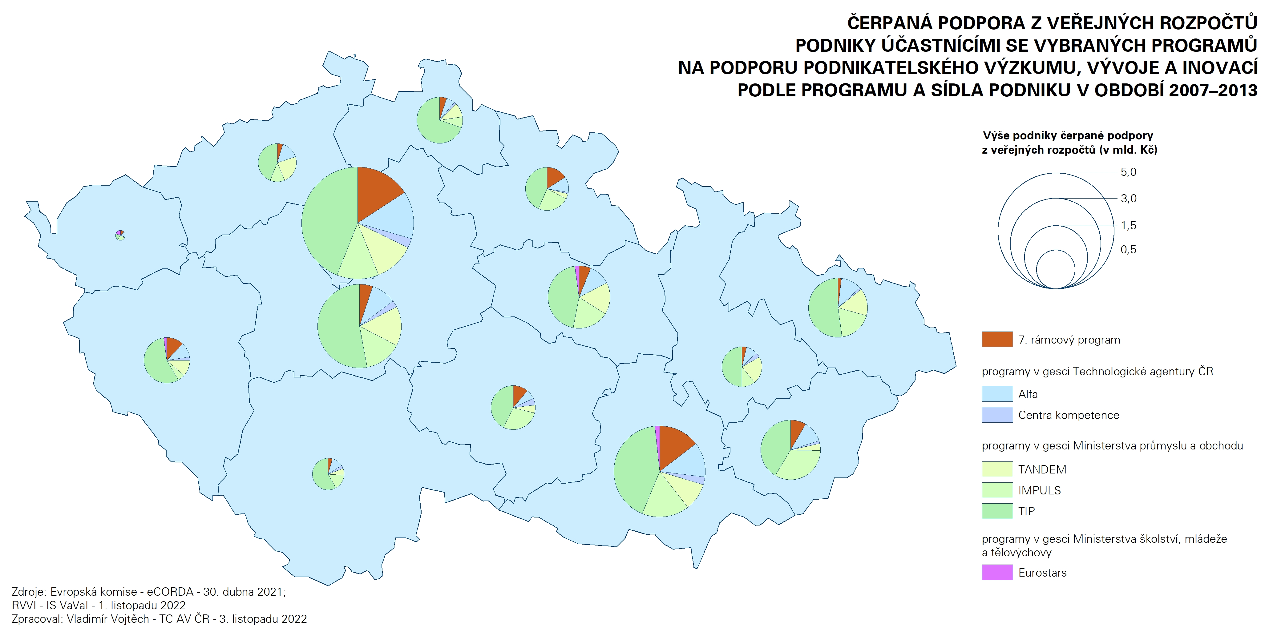 Příspěvky z října 2022 se zaměřovaly na hodnocení odvětvové a velikostní struktury podniků účastnících se rámcových programů, a to včetně geografického pohledu. Nyní je na řadě zhodnocení kontextu této účasti ve světle ostatních tuzemských programů na podporu podnikatelského výzkumu, vývoje a inovací – konkrétně programů v gesci Technologické agentury ČR, Ministerstva průmyslu a obchodu a Ministerstva školství, mládeže a tělovýchovy. Hodnocena je výše podpory, kterou podniky účastnící se porovnávaných programů čerpají na podporu svých výzkumných, vývojových a inovačních aktivit z veřejných rozpočtů. V případě rámcových programů byly zdrojem dat aktuální databáze Evropské komise eCorda (k 31. dubnu 2021 pro 7. rámcový program, k 17. květnu 2022 pro Horizont 2020 a k 15. září 2022 pro Horizont Evropa). Hodnocen byl ukazatel výše příspěvku Evropské unie účastníkům, přičemž v potaz byli bráni účastníci typu příjemců.