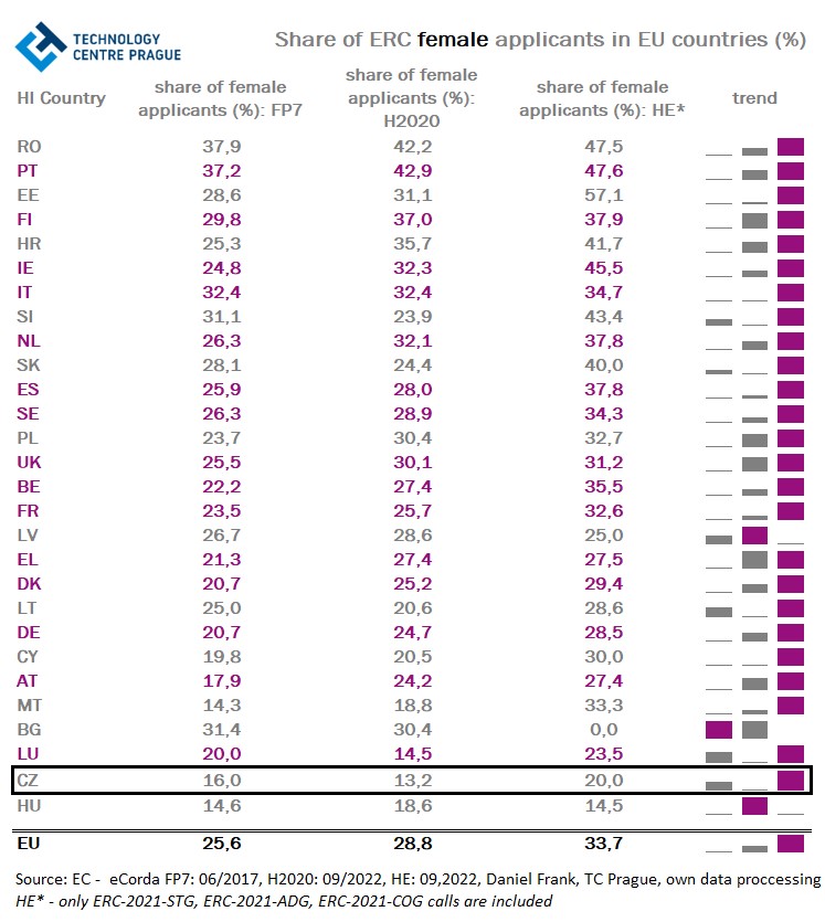 Pozice ČR mezi státy EU v oblasti ERC de facto kopíruje postavení ČR v publikovaných genderových statistikách (viz výše). ČR se nachází v tomto ukazateli mezi státy EU až na předposledním místě, před Maďarskem. Dodejme, že ČR a Maďarsko mají dle dostupných, neúplných dat Eurostatu za rok 2021 [6] nejnižší podíl žen ve výzkumu, ze všech porovnávaných států. U většiny unijních států je možné pozorovat vzestupný trend podílu výzkumných pracovnic, které se pokoušely prestižní granty ERC získat. U Rumunska a Portugalska se v prvních výzvách ERC programu Horizont Evropa vyhoupl poměr žadatelek k žadatelům až téměř nad 50%. Až za těmito zeměmi se nacházejí technologicky vyspělé státy. Je třeba dodat, že zde hodnotíme pouze aktivitu směrem k ERC grantům, nikoliv kvalitu předkládaných návrhů projektů.
