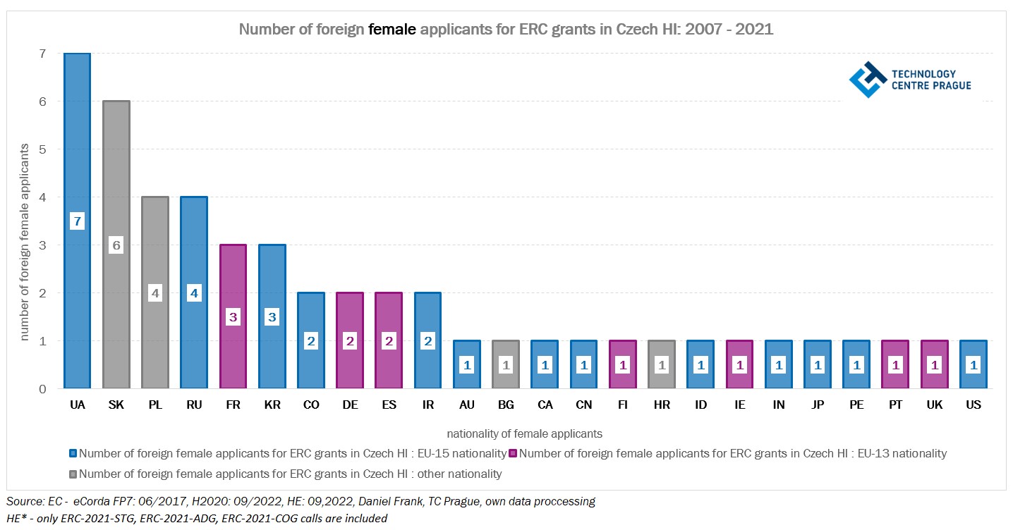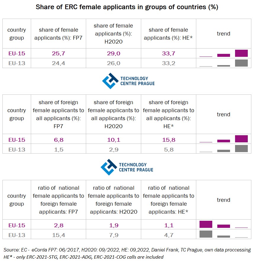 Vzestupný trend podílu žadatelek o grant ERC napříč RP lze pozorovat rovněž na úrovni skupin států EU-15 (včetně UK) a EU-13 (viz tabulka 2, horní část). Je vidět, že mezi skupinami států EU-15 a EU-13 nejsou v tomto ukazateli velké rozdíly a podíl žen usilujících o grant ERC je v obou skupinách států ve všech třech RP téměř totožný. Zajímavé může být porovnání podílu zahraničních žadatelek o grant ERC v hostitelských institucích unijních zemí. I zde je vidět vzestupná tendence a vzrůstající podíl od 7. RP k programu Horizont Evropa. Zároveň je, ale patrné, že ve státech EU-15 je podíl zahraničních výzkumnic v roli žadatelek o grant ERC o něco vyšší než ve státech EU-13, což může být způsobeno větší vědeckou prestiží hostitelských institucí ve státech EU-15 (viz tabulka 2, prostřední část).