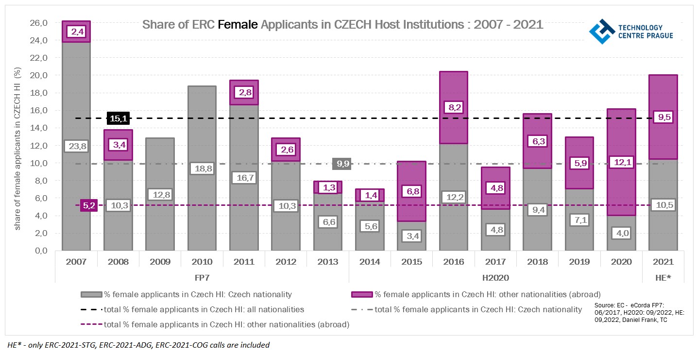 V tomto kontextu bude zajímavé porovnat, jak se situace vyvíjí v průběhu času na úrovni EU a hlavně ČR. V této analýze se tedy budeme stručně zabývat genderovými poměry v podávaných návrzích projektů pod hlavičkou ERC v EU a ČR v 7. RP, v programu H2020 a prvních třech výzvách programu Horizont Evropa. Zpracovaná data pokrývají období 2007 – 2021, tj. relativně dlouhé časové období 15 let. Pro analýzu je využita neveřejná databáze EK – eCorda, která tvoří datový základ většiny prováděných analýz a monitoringu účasti v RP. Neveřejná databáze e-Corda umožňuje ve velmi hrubých obrysech provést genderovou analýzu u prestižních individuálních grantových schémat, jakými jsou granty ERC a granty MSCA – IF, neboť u žadatelek a žadatelů o tyto granty uvádí jejich gender a národnost. Další osobní údaje např. věk žadatelek a žadatelů, které by mohly být využity pro podrobnější analýzu, nejsou bohužel v této databázi uvedeny.