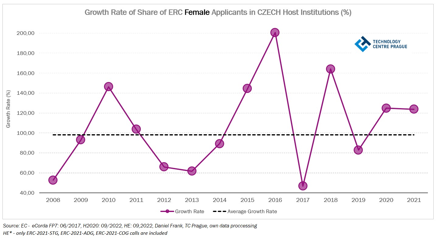 Graf 2: Tempo růstu podílu žadatelek o grant ERC v hostitelských institucích ČR v letech 2007– 2021. Černá přerušovaná čára představuje průměrné tempo růstu.