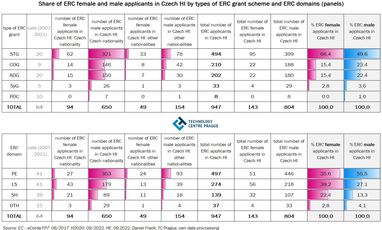 Dle informací a dat uvedených na webových stránkách NKC – gender a věda není český výzkum dlouhodobě schopen dát příležitost kvalifikovaným ženám [7]. Ze 47 mapovaných evropských a dalších zemí skončila Česká republika podle publikace Evropské komise She Figures 2021 na 44. pozici (tedy čtvrtá od konce) s podílem 26,6 % žen mezi výzkumníky. Průměr EU-28 v roce 2018 byl přitom 33,8 % [3, 7]. Tyto skutečnosti se zákonitě projevuji i v souvislosti s nižší aktivitou resp. podílem žen v ČR v roli žadatelek o granty ERC. NKC – gender a věda uvádí, že zastoupení žen mezi studujícími magisterského studia v průběhu posledních 20 let pomalu roste, stejně tak na doktorském stupni má mírně vzestupný trend. Tento stav však dlouhodobě nemá vliv na situaci ve výzkumu samotném: Největší propad v zastoupení žen na pomyslné studijně-profesní dráze je mezi absolventy doktorského studia a výzkumníky. Zastoupení žen od lektorské pozice směrem k profesuře klesá. Největší propad na pomyslné akademické dráze žen najdeme mezi odbornými asistentkami a docentkami [7]. Zdá se, že právě nižší zastoupení žen mezi vysokoškolskými akademickými pracovníky a složitější profesní dráha ve vědě jsou jedněmi z příčin jejich nízkého počtu mezi uchazeči o grant ERC.