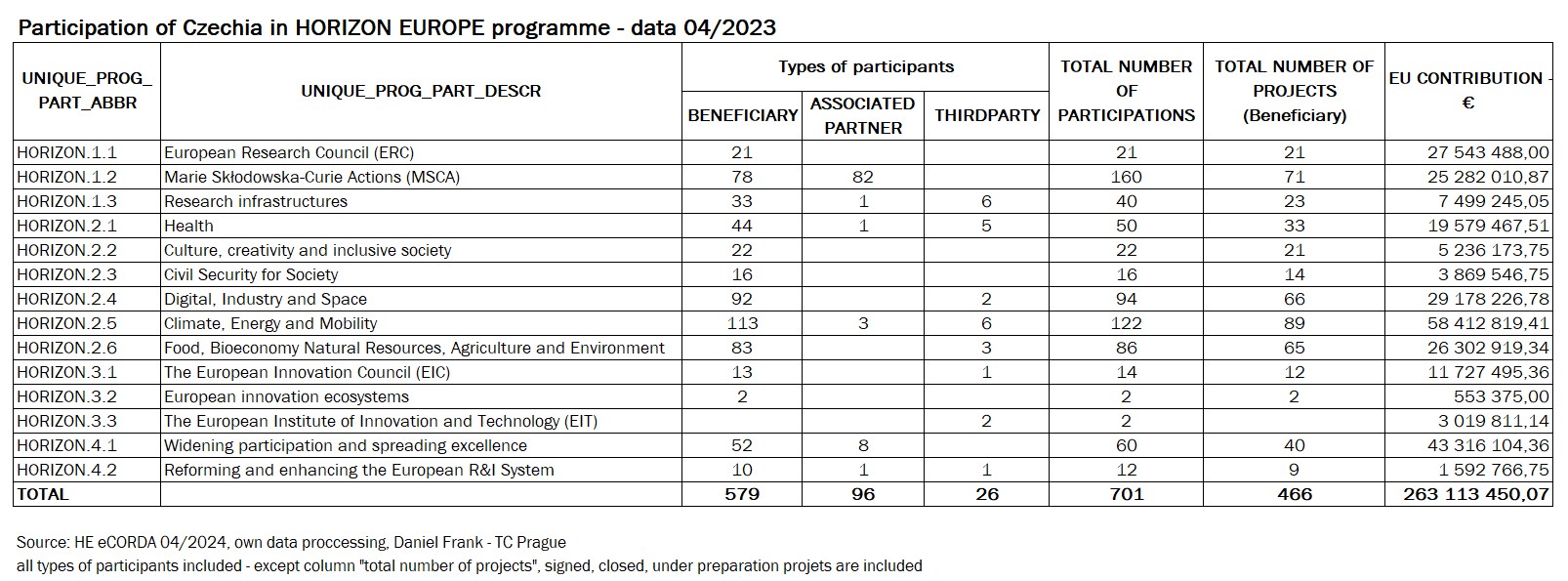 Table 1 - Participation of Czechia in HORIZON EUROPE