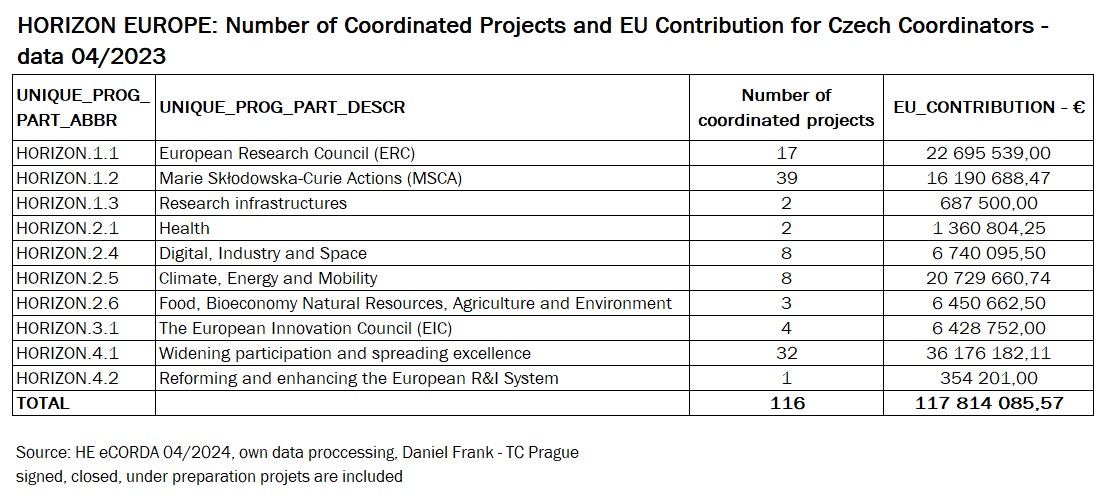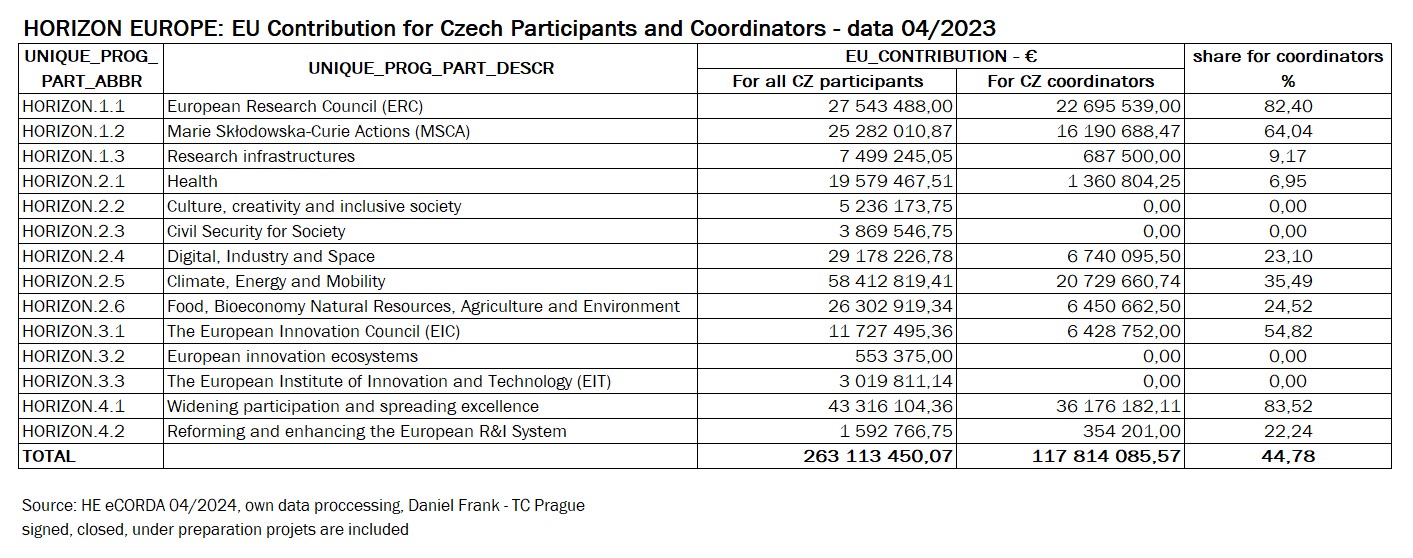 Table 4 - Horizon Europe: EU Contribution for Czech Participants and Coordinators