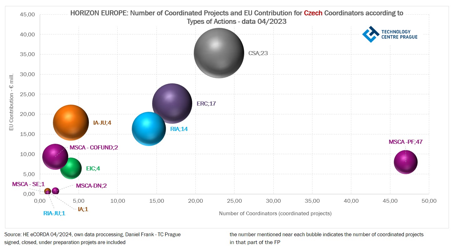 Figure 3 - Horizon EUROPE: Number of Coordinated Projects and EU Contribution for Czech Coordinators according to Types of Actions