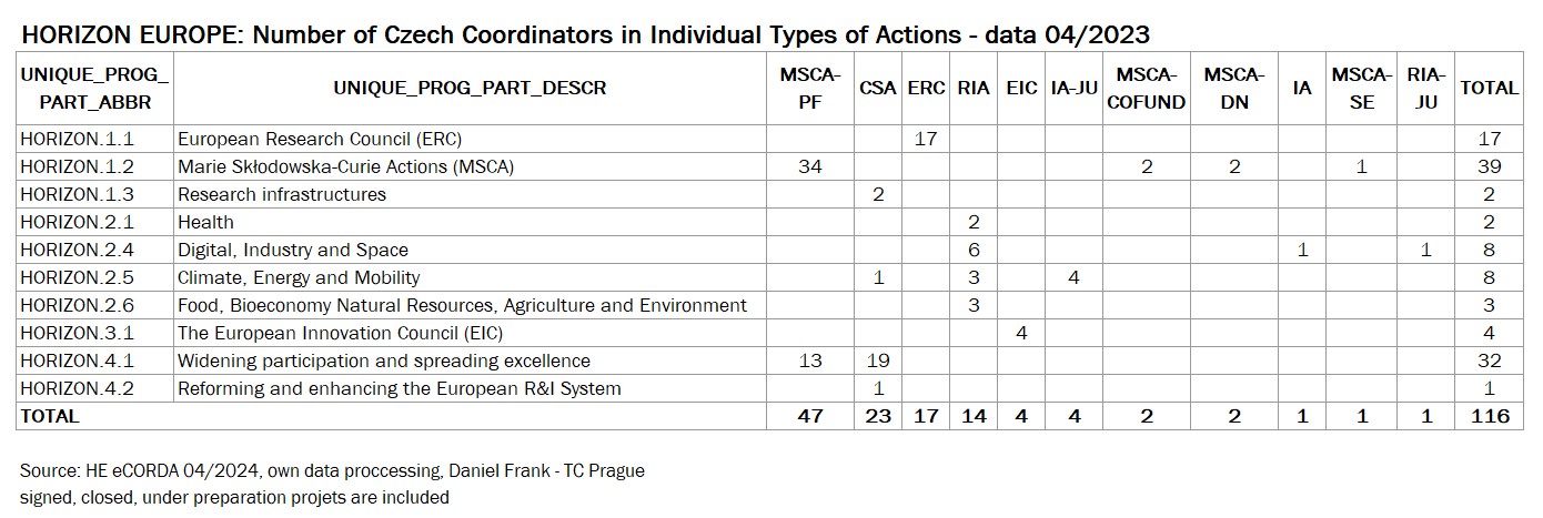 Table 3 - HORIZON EUROPE: Number of Czech Coordinators in Individual Types of Actiones