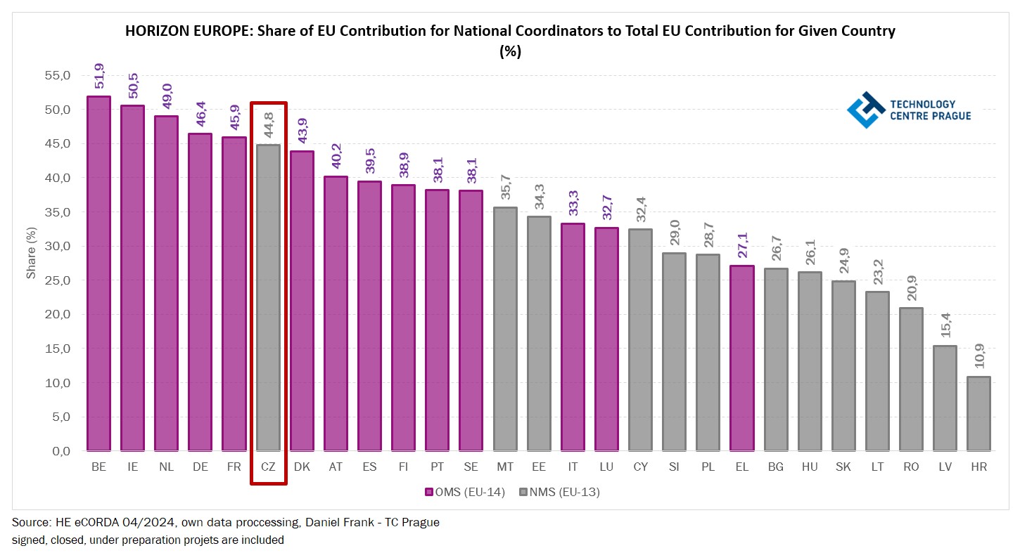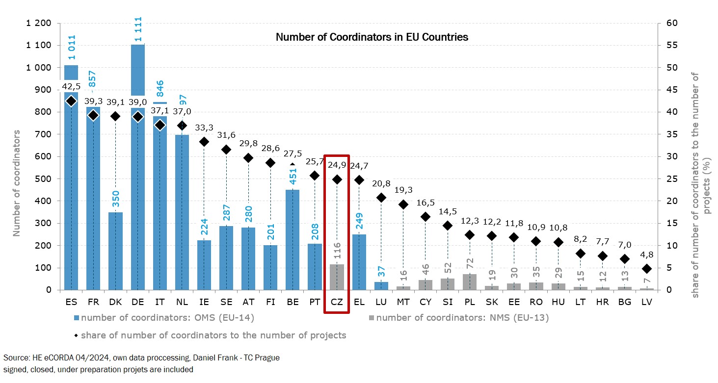 Níže uvedené tabulky a grafy prezentují v základních obrysech dosavadní působení ČR v programu Horizont Evropa. Z uvedených dat lze zdůraznit skutečnost, že pro dosavadní účast ČR v programu Horizont Evropa mají velký přínos čeští koordinátoři projektů tohoto RP. Čeští koordinátoři tvoří více než 20 % české účasti mezi přímými příjemci finační podpory z rozpočtu programu Horizont Evropa z ČR a přinášejí do celkové národní bilance téměř 45 % celkové finační podpory pro ČR z programu Horizont Evropa. Větším podílem přispívají k celkovému národnímu zisku z programu Horizont Evropa jen koordinátoři z Belgie, Irska, Nizozemska, Německa a Francie. Oproti stavu v programu H2020 se ČR daří ve větší míře koordinovat tzv. RIA projekty. Na tomto výsledku májí zásluhu především české vysoké školy, jak jsme již podrobně analyzovali v blogu "Kola se roztočila: Českým vysokým školám a univerzitám se daří koordinovat evropské RIA projekty". Situaci ohledně koordinace projektů jsme podrobně sledovali v blogu "Jak vypadá koordinace projektů v programu Horizont Evropa. Přibližuje se ČR výzkumně vyspělým zemím EU?"