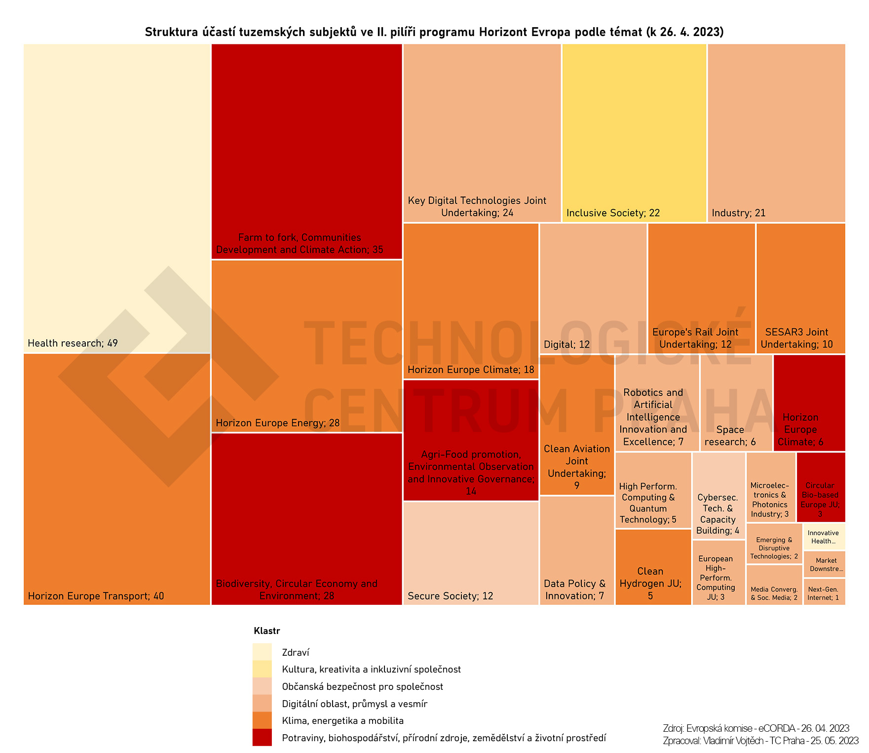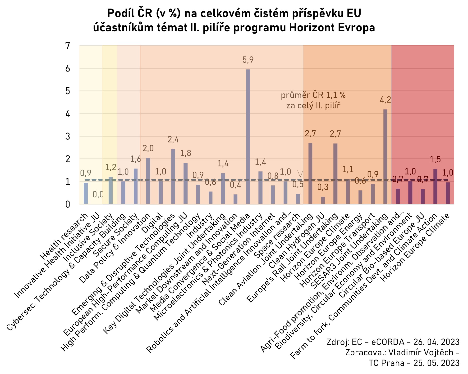 Shrnutí: Z hlediska témat II. pilíře programu Horizont Evropa se tuzemské subjekty nejčastěji účastnily zdravotnického výzkumu, výzkumu v oblasti dopravy (obecně, i konkrétně letectví), potravinové bezpečnosti (vč. rozvoje komunit a opatření v oblasti klimatu), energetiky, biodiverzity, cirkulární ekonomiky a životního prostředí. Nadprůměrné zastoupení má ČR ve výzkumu letectví, železniční dopravy a datové politiky. Naopak výrazně pod průměrem je v tématech průmyslu, výzkumu vesmíru a čistého vodíku.