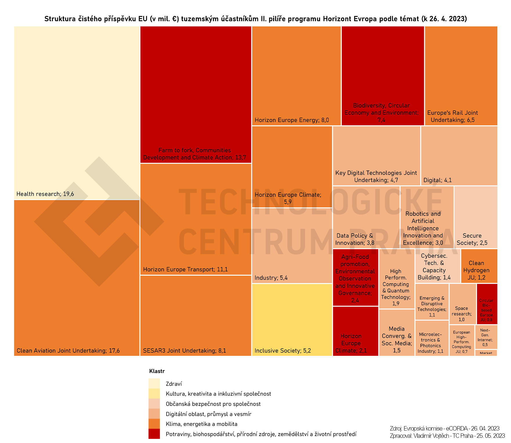 Nejvyšší čistý příspěvek EU nárokovali tuzemští účastníci ve zdravotnickém výzkumu (19,6 mil. €, tj. 14 % čistého příspěvku EU tuzemským účastníkům II. pilíře) a ve společném podniku pro čisté letectví (17,6 mil. €, tj. 12 %). Více než 10 milionů € nárokovali tuzemští účastníci v tématu zajištění potravinové bezpečnosti a odolnosti (tzv. strategie „z farmy na vidličku“), vč. rozvoje komunit a opatření v oblasti klimatu (13,7 mil. €, tj. 10 %) a v tématu dopravy (11,1 mil. €, tj. 8 %).