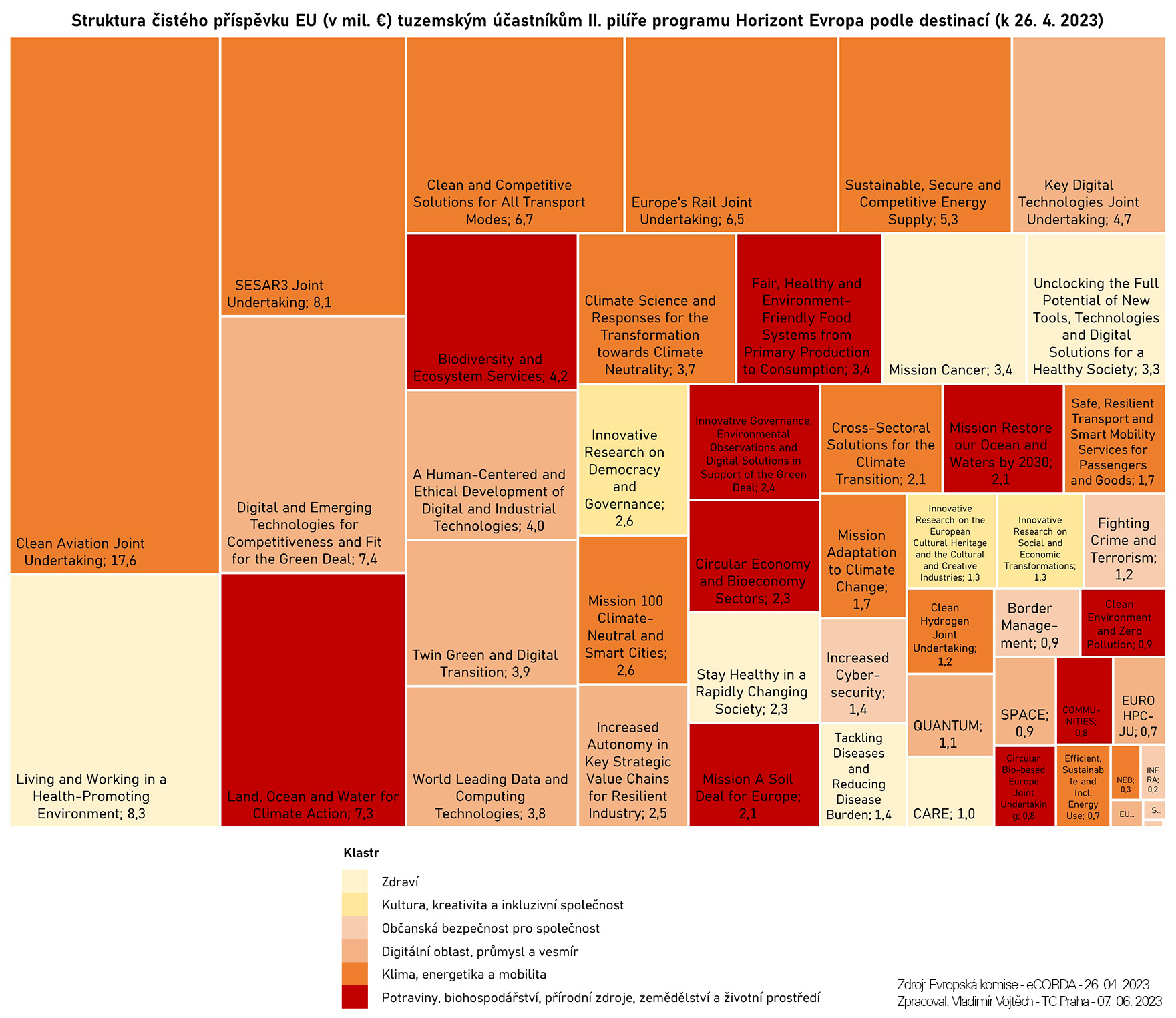 Nejvyšší čistý příspěvek EU nárokovali tuzemští účastníci ve společném podniku Clean Aviation (17,6 milionů €). Zhruba po 8 milionech € nárokovali tuzemští účastníci destinace Living and Working in a Health-Promoting Environment z Klastru 1 (Zdraví) a společného podniku jednotného evropského nebe (SESAR3). Čistý příspěvek EU vyšší než 5 milionů € vykázali tuzemští účastníci v dalších třech destinacích Klastru 5 (Klima, energetika a mobilita) a v destinacích Digital and Emerging Technologies for Competitiveness and Fit for the Green Deal (7,4 mil. €) a Land, Ocean and Water for Climate Action (7,3 mil. €).
