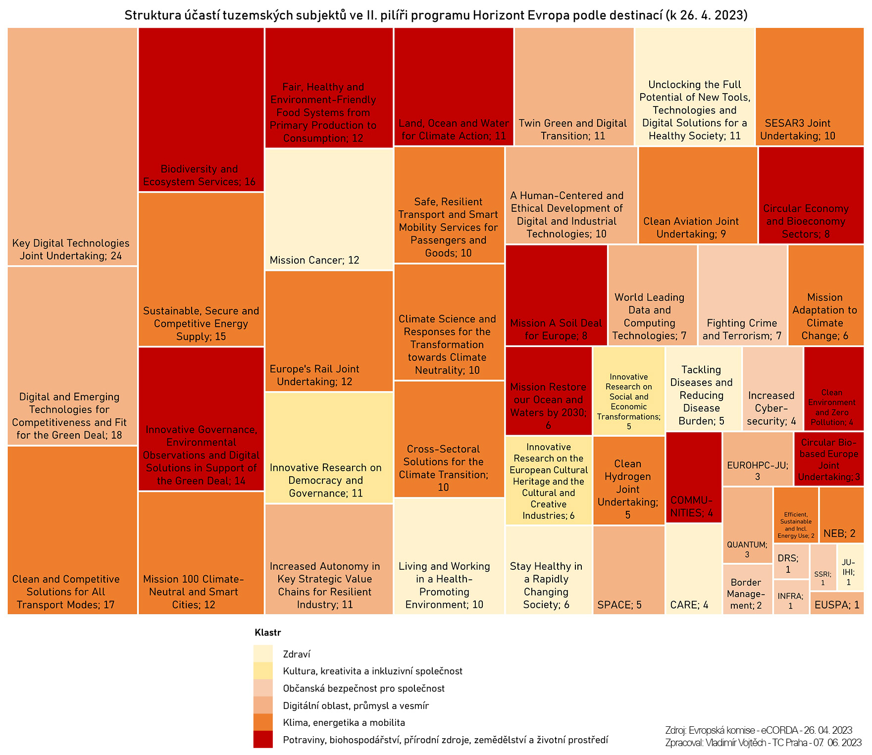 Příspěvek z 26. května 2023 se zabýval strukturou tuzemské účasti v programu Horizont Evropa (dále jen „HE“) podle jednotlivých témat II. pilíře. Avšak i jednotlivá témata, tak jak je vymezuje Evropská komise, jsou stále příliš široká. V Klastru 6 např. sdružují dohromady biodiverzitu a oběhové hospodářství nebo zajištění potravinové bezpečnosti, rozvoj komunit a opatření v oblasti klimatu. Právě proto je důležité zabývat se tematickou strukturou tuzemské účasti ve II. pilíři až na úrovni destinací. I v tomto případě pracujeme s databází Evropské komise eCORDA k 26. dubnu 2023, tzn. s 390 tuzemskými účastmi ve II. pilíři s nárokem na čistý příspěvek EU ve výši 143 milionů €.