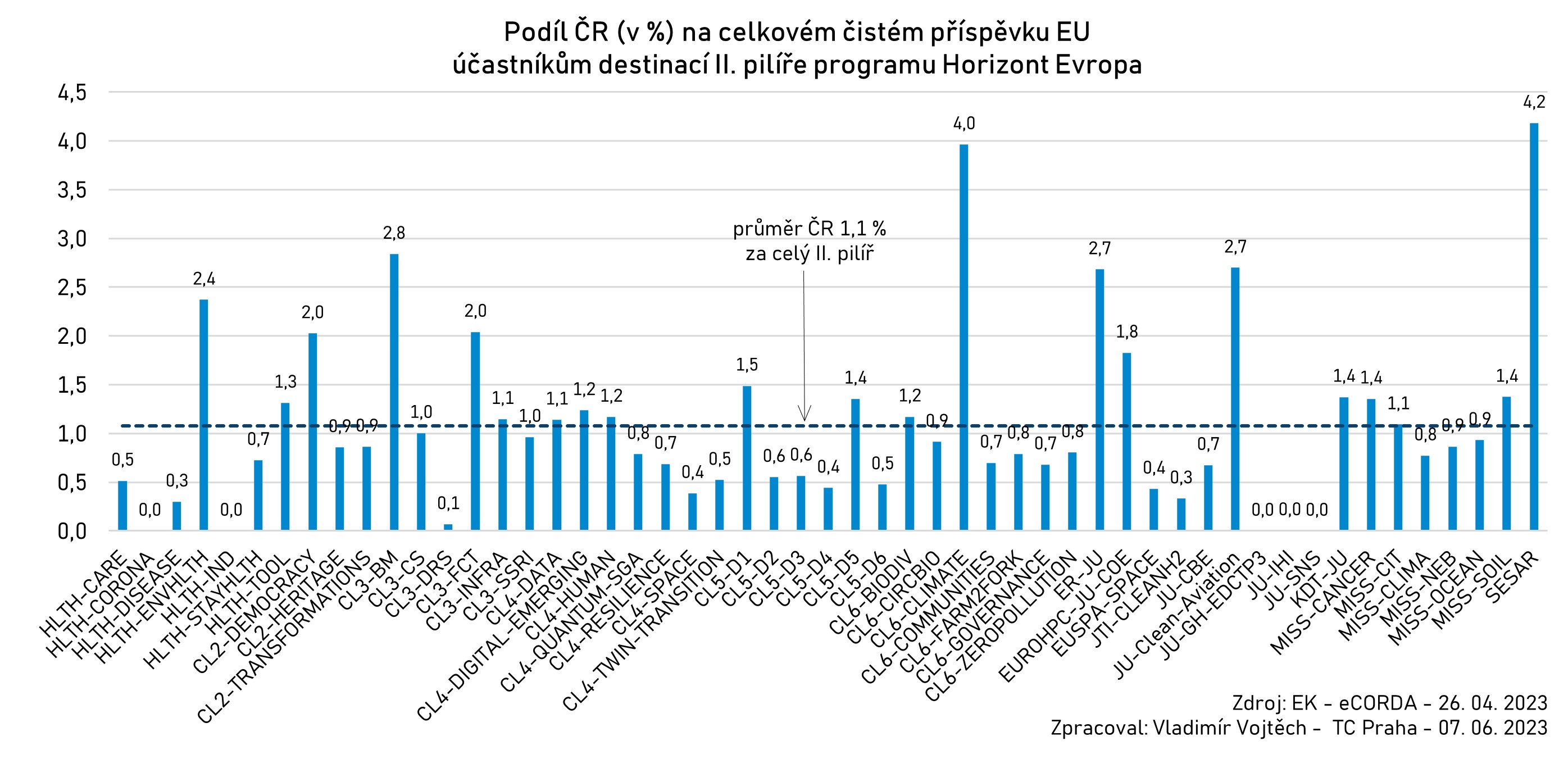 Shrnutí: Ve II. pilíři programu Horizont Evropa se tuzemské subjekty nejčastěji účastnily destinací spadajících do Klastrů 4, 5 a 6. Z hlediska čistého příspěvku EU pak dominovaly destinace Klastru 5. Nicméně výše nárokovaného čistého příspěvku EU tuzemskými subjekty v těchto klastrech neodpovídá potenciálu ČR a je zde prostor pro určité zlepšení. Výrazně podprůměrná je ČR v zapojení do výzkumu vesmíru a vývoje vodíkových technologií. Naopak nadprůměrně se tuzemské subjekty na úrovni konkrétních destinací účastnily dopravního výzkumu (letectví, železniční doprava), výzkumu zaměřeného na ochranu půdy a vod, bezpečnostního výzkumu, výzkumu prostředí podporujícího zdraví a výzkumu demokracie a vládnutí.
