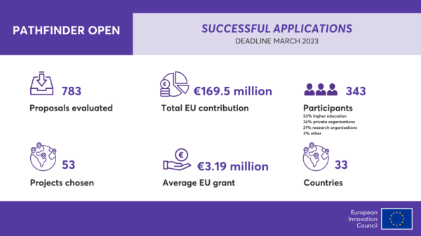 Evropská komise zveřejnila výsledky výzvy EIC Pathfinder Open 2023. Ze 783 hodnocených žádostí bylo podpořeno 53 projektů. Česká republika zaznamenala 7 úspěšných účastí v 5 projektech včetně jedné koordinace, a to ČVUT v pozci lídra projektu SENSORBEES. Další informace jsou k dispozici zde.