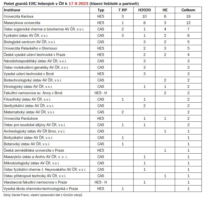 Přehled institucí z ČR, ve kterých se řešil ERC grant, najdete v tabulkách 1 a 2. V tabulce 1 je celkový počet ERC grantů řešených na institucích v ČR (hlavní řešitelé a partneři), v tabulce 2 jsou uvedeny počty grantů ERC řešených v ČR přímo hlavními řešiteli. V tabulkách nejsou započítány granty ERC udělené hlavním řešitelům cizincům, kteří přenesli grant ERC do zahraničí.