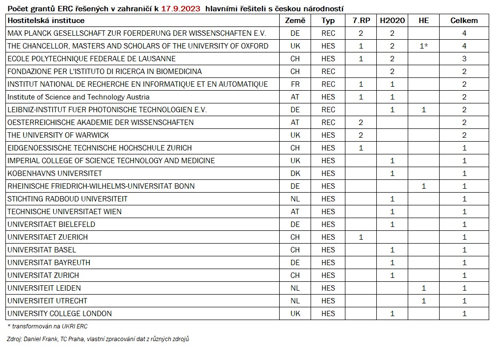 Granty ERC však výzkumníci české národnosti řeší i v zahraničí. Od roku 2007 to bylo celkem 37 grantů ERC. Z toho jeden udělený grant ERC byl transformován na grant ERC UKRI (UK nebylo na počátku programu HE asociováno k programu Horizont Evropa). Přehled institucí a počet grantů ERC udělených řešitelům z českou národností uvádí tabulka 3.