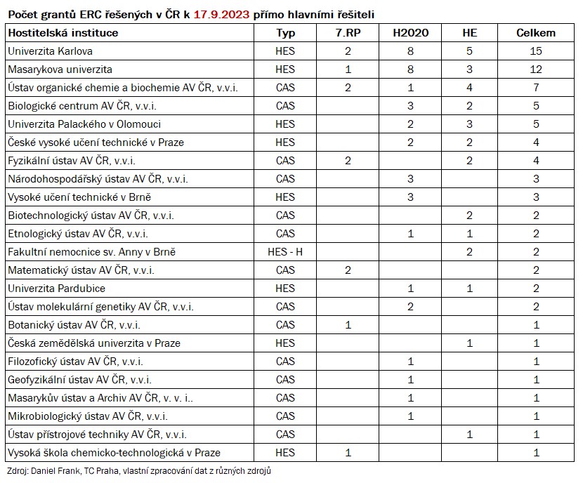 Téma ERC je v současné době žhavým tématem výzkumné politiky v ČR. Z tohoto důvodu jsem se rozhodl, že provedu pokus o přehlednou rekapitulaci grantů ERC řešených v ČR nebo grantů ERC řešených českými výzkumníky v zahraničí od roku 2007 do současnosti, tj. do 17.9.2023. Práce to nebyla snadná, neboť oficiální datové zdroje nejsou vždy přesné (spíše jsou nepřesné) a statistiky ERC grantů se mění velmi rychle v čase, a to i vzhledem k jejich přenositelnosti mezi hostitelskými institucemi a zeměmi. Je tedy možné, že i přes sebevětší snahu o přesnost, nemusejí být údaje na 100 % validní. Za chyby, ať již způsobené kvalitou datových zdrojů, nebo chyby vzniklé při zpracování těchto dat, se předem omlouvám. Budu rád za každou reakci čtenářů a návštěvníků webu HE.
