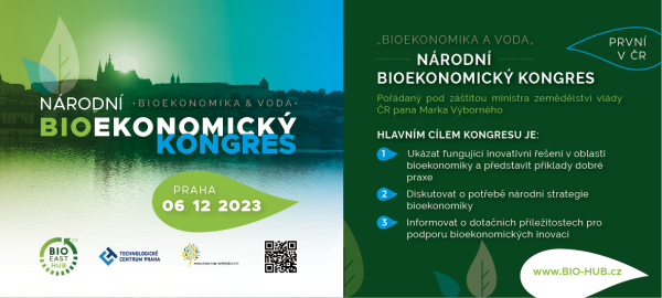 Bioekonomický BIOEAST HUB CZ a Technologické centrum Praha pořádají dne 6. prosince 2023 pod záštitou ministra zemědělství pana Marka Výborného Národní bioekonomický kongres s podtitulem „Bioekonomika a voda“.