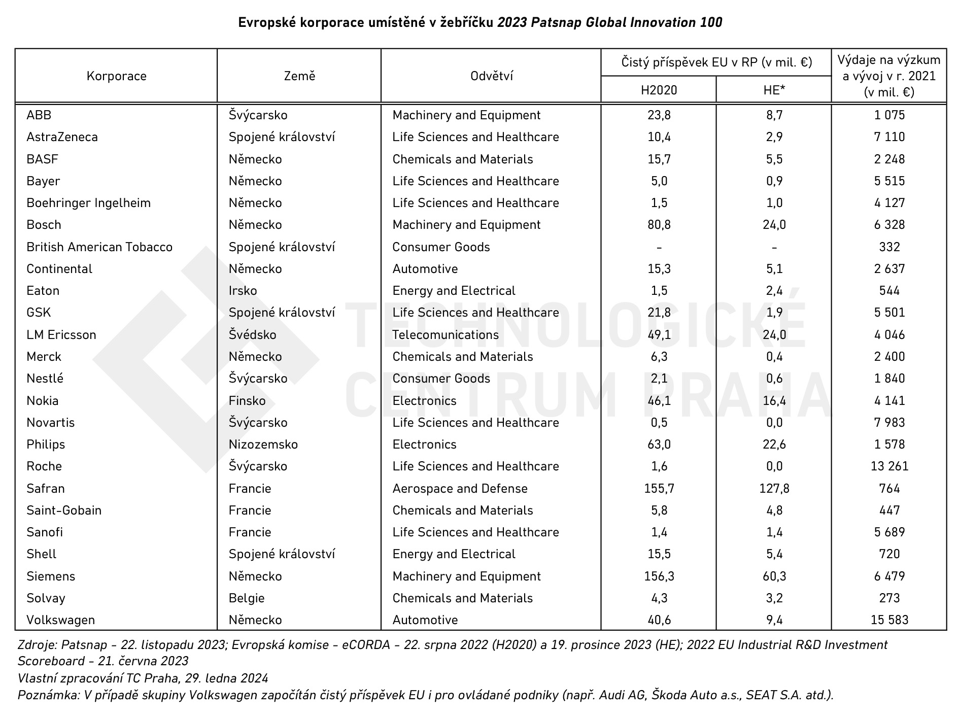 Tabulka níže uvádí, jak si stojí 24 evropských korporací (umístěných mezi 100 největšími globálními inovátory) v rámcových programech Evropské unie – v programu Horizont 2020 (dále jen „H2020“) v období 2014–2020 a v současném programu Horizont Evropa (2021–2027; dále jen „HE“). Uváděných 24 evropských korporací z programu H2020 dohromady nárokovalo čistý příspěvek EU 724 mil. €, což odpovídá částce, kterou z tohoto programu nárokovali polští účastníci (ti z programu H2020 nárokovali 746 mil. €; účastníci z ČR z H2020 nárokovali 509 mil. €). Obdobně je tomu i v programu HE. 24 evropských korporací k 19. prosinci 2023 z HE nárokuje čistý příspěvek EU 329 mil. € – v podstatě stejnou částku jako všichni čeští účastníci.