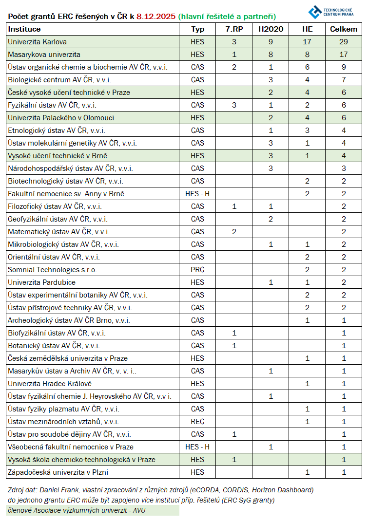 Poznámka: Při interpretaci výsledků a dat uvedených výše v tabulkách bychom měli mít na paměti důležitou skutečnost. Příprava a řešení ERC grantu mohou být v ČR v některých případech prováděny současně na pracovištích VŠ a AV ČR (případně na společných pracovištích VŠ a AV ČR). To znamená, že porovnávání jednotlivých institucí dle počtu získaných ERC grantů má s ohledem na tuto skutečnost omezenou vypovídací hodnotu.