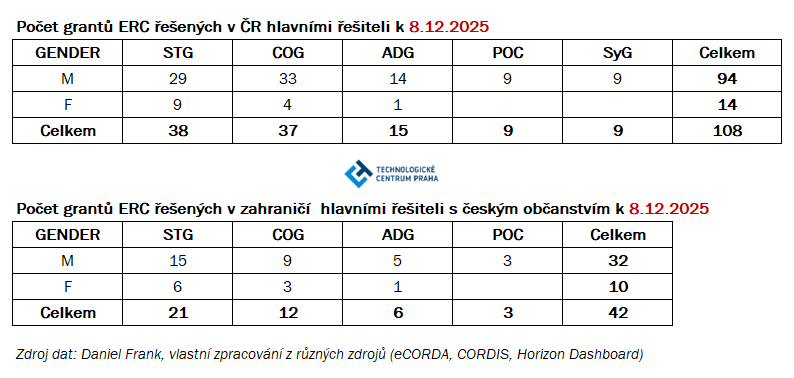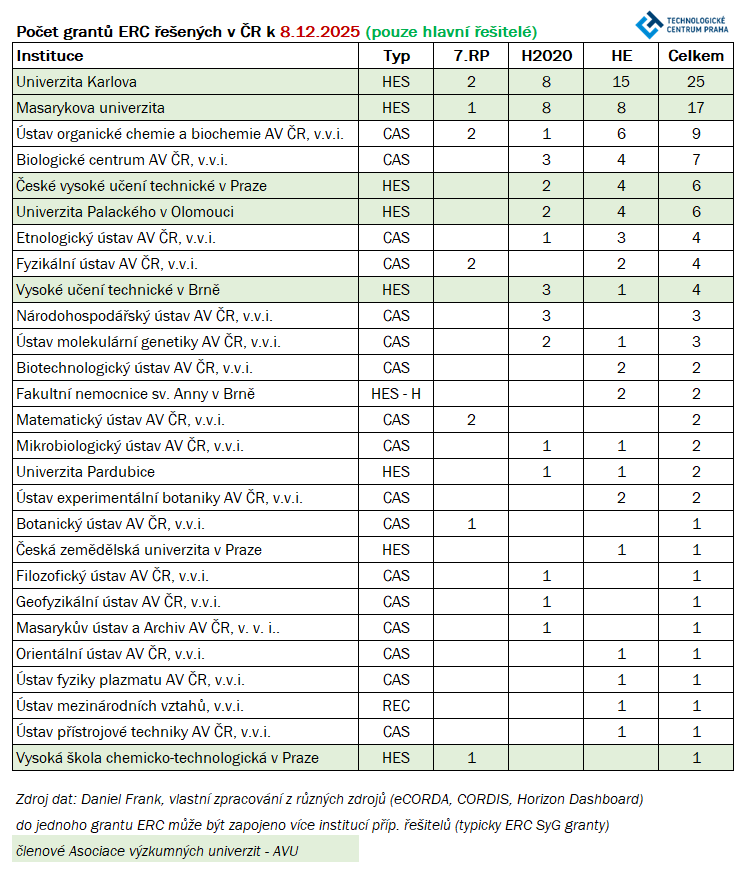 Přes výše zmíněná úskalí s daty a jejich zdroji se podařilo zjistit, že se v ČR od roku 2007 do současnosti (data k 8. 12. 2025) řešilo 126 grantů ERC. Z toho 108 grantů ERC bylo řešeno přímo hlavními řešiteli, na ostatních grantech ERC se instituce z ČR podílely pouze jako partneři. Celková podpora pro hlavní řešitele i partnery grantů ERC řešených od roku 2007 až do současnosti v ČR přesáhla 178,4 mil. €. (7. RP - 16,3 mil. €. H2020 - 64,1 mil. €, HE k 12/2025 - 98,0 mil. €). Do statistik nebyly započítány dva granty ERC přenesené zahraničními hlavními řešiteli z ČR do zahraničí, jeden grant ERC řešený českým řešitelem v UK, který byl kvůli restrikci účasti UK v letech 2021-2023 v HE transformován na UKRI ERC, jeden grant získaný českou řešitelkou ve Švýcarsku ještě před asociací Švýcarska k programu HE a další dva granty ERC, ve kterých bylo partnerství české instituce ukončeno.