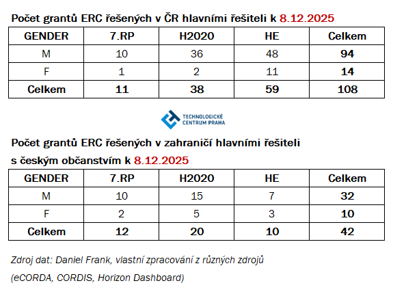 V 7. RP bylo na českých hostitelských institucích řešeno 16 grantů ERC, z nichž 11 řešili přímo hlavní řešitelé (Principal Investigators). Z 11 hlavních řešitelů bylo 7 řešitelů české národnosti a 4 cizinci. V programu Horizont 2020 bylo v ČR řešeno 43 grantů ERC, z nichž 38 připadalo přímo na hlavní řešitele. Výzkumníci české národnosti řešili 34 grantů ERC. V programu Horizont Evropa se dosud řeší v ČR 67 grantů ERC. Celkem 59 grantů ERC je v rukou hlavních řešitelů. Česká národnost je spojena s 43 granty ERC. Dalších 17 grantů ERC řeší v ČR zahraniční výzkumníci. Ve výzvě ERC-SyG-2025 jsou financovány tři granty, na jejichž řešení se podílí v českých hostitelských institucích pět hlavních řešitelů - čtyři z ČR a jeden ze zahraničí. To bude komplikovat statitiky, neboť zde platí, že jednoho grantu ERC se může zúčastnit více hlavních řešitelů.