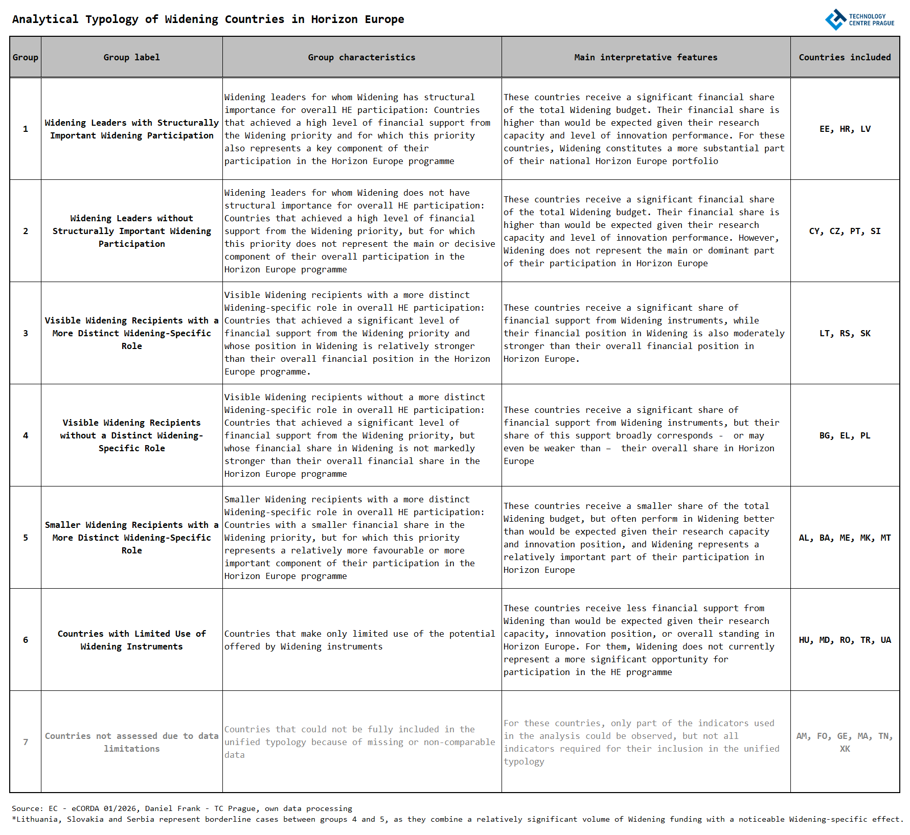 Tato typologie (viz tabulka níže) ukazuje, že mezi wideningovými zeměmi existují výrazné rozdíly – od zemí, pro něž Widening představuje klíčovou součást jejich účasti v RP, přes státy, které jej využívají spíše jako doplňkový zdroj financování, až po země, které svůj potenciál zatím plně nevyužívají.