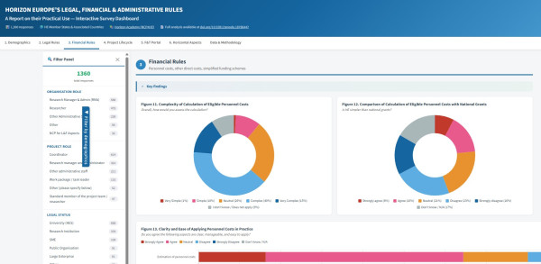 Dashboard umožňuje pracovat s daty z dotazníkového šetření mezi 1 360 účastníky programu Horizont Evropa a filtrovat výsledky podle země, typu organizace, role respondenta a dalších parametrů. Uživatelé tak mohou podrobněji zkoumat, jak příjemci napříč Evropou vnímají praktické fungování pravidel programu – od osobních nákladů a lump sum projektů po evaluaci, reporting či audity.