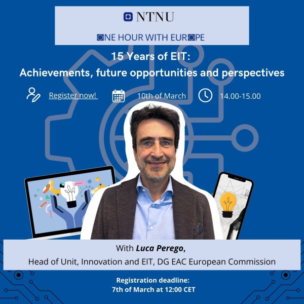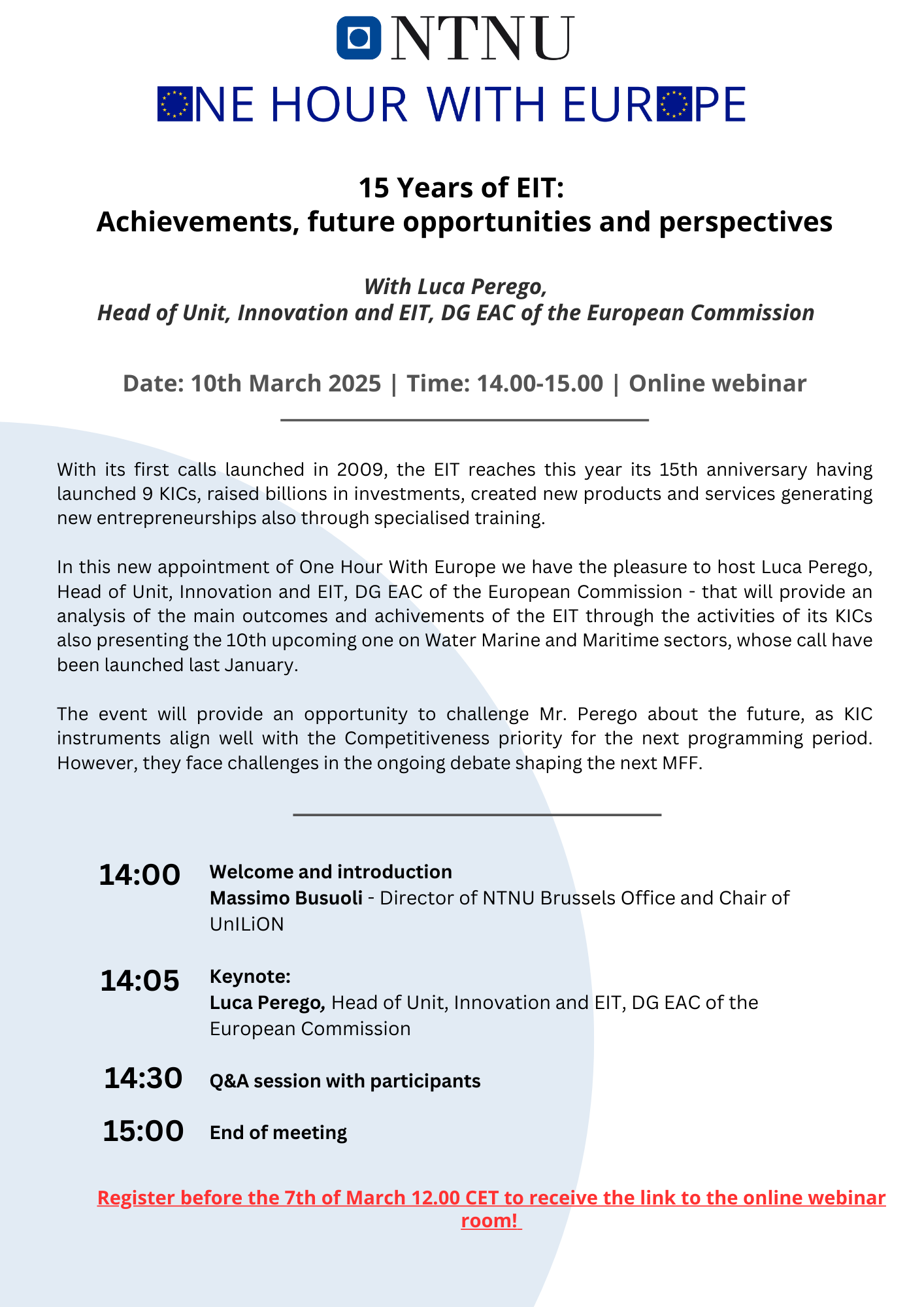 Další ze série webinářů nazvané One Hour woth Europe, které pravidelně organizuje kancelář Norské univerzity věd a technologií v Bruselu (NTNU), se uskuteční dne 10. března 2025 (14:00-15:00 SEČ),