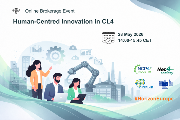 Sítě národních kontaktů NCP4Industry+, Ideal-ist2027 a Net4Society zvou výzkumníky, zástupce průmyslu, digitální inovátory i další aktéry na online partnerskou burzu Human-Centric Innovation in Cluster 4 zaměřenou na připravované výzvy roku 2027 v programu Horizont Evropa, Klastr 4 – digitalizace a průmysl.