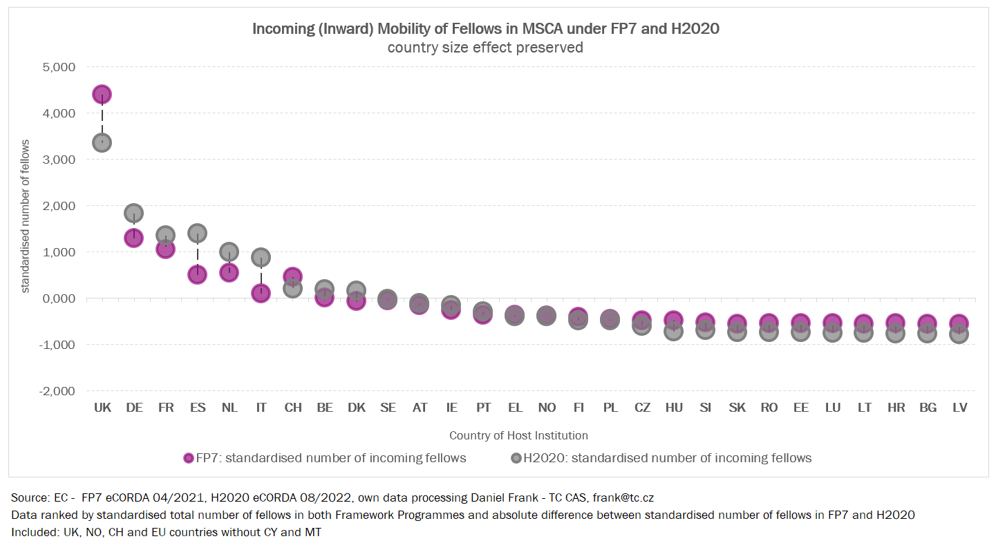 Při porovnání absolutního počtu stážistů (stipendistů) MSCA jsou v popředí výčtu jednotlivých států (jako u většiny podobných analýz založených na absolutních počtech) velké evropské státy jako Spojené království, Itálie, Německo, Španělsko a Francie. Absolutní počty však nezohledňují výzkumné kapacity jednotlivých zemí a rovněž neeliminují efekt rozdílné velikosti posuzovaných zemí. Navíc se velmi obtížně porovná bilance účasti ve dvou odlišných RP. V případě priority MSCA bylo v programu H2020 např. řešeno 1,6x více projektů než v předchozím 7. RP. Z tohoto důvodu je často vhodné absolutní hodnoty účasti relativizovat, resp. standardizovat vhodnou metodou, tak aby byla v obou RP snáze porovnatelná. Z tohoto důvodu - vzájemného porovnání účasti v projektech MSCA v 7. RP a programu H2020, byly počty migrujících stážistů MSCA, u některých analytických výstupů standardizovány prostřednictvím tzv. z-skore.