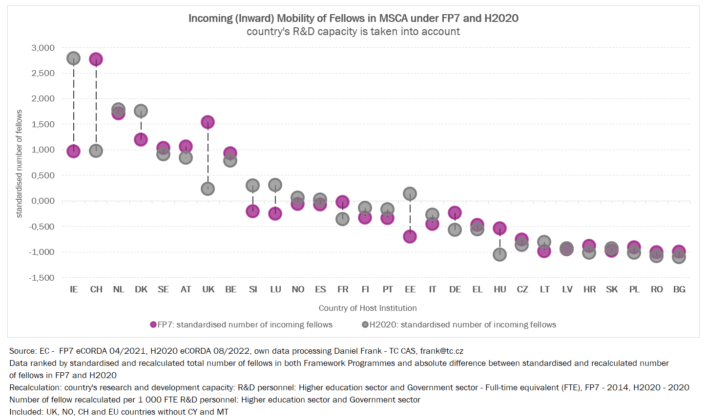 Předchozí analýza se týkala bilance standardizovaného počtu příchozích zahraničních stážistů do hostitelských institucí daných vybraných zemí bez zohlednění velikosti jejich výzkumné kapacity. Následující graf porovnává počet příchozích výzkumných pracovníků přepočtený na 1 tis. pracovníků ve výzkumu a vývoji ve vysokoškolském a vládním sektoru, ze kterých se většina stipendistů MSCA rekrutuje. (poznámka: přepočet je poté standardizován). Tímto přepočtem je eliminován efekt velkosti daných zemí. Výsledné pořadí zemí dle jejich atraktivity pro příchozí zahraniční stážisty MSCA je poněkud jiné než v předchozím případě. Na prvních místech se objevují Irsko, Švýcarsko, Nizozemsko, Dánsko, Švédsko a Rakousko, které v poměru ke své výzkumné kapacitě přitahují největší množství výzkumných pracovníků ze zahraničí. U Irska a Dánska se navíc setkáváme s pozitivním trendem jejich přitažlivosti pro zahraniční MSCA stážisty od 7. RP k programu H2020. Zajímavé je snížení zájmu pro zahraniční výzkumníky u Maďarska, kam přijíždělo v 7. RP více výzkumníků ze zahraničí, než je tomu v programu H2020. Účast zahraničních stážistů MSCA v českých výzkumných institucích zůstala v poměru k účasti zahraničních výzkumníků v ostatních sledovaných zemích v obdobích 2007-2013 (7.RP) a 2014-2020 (H2020) prakticky nezměněna a je v porovnání s ostatními zeměmi EU poměrně nízká.