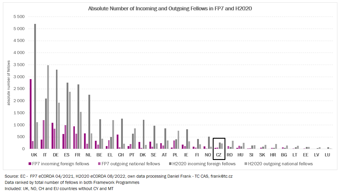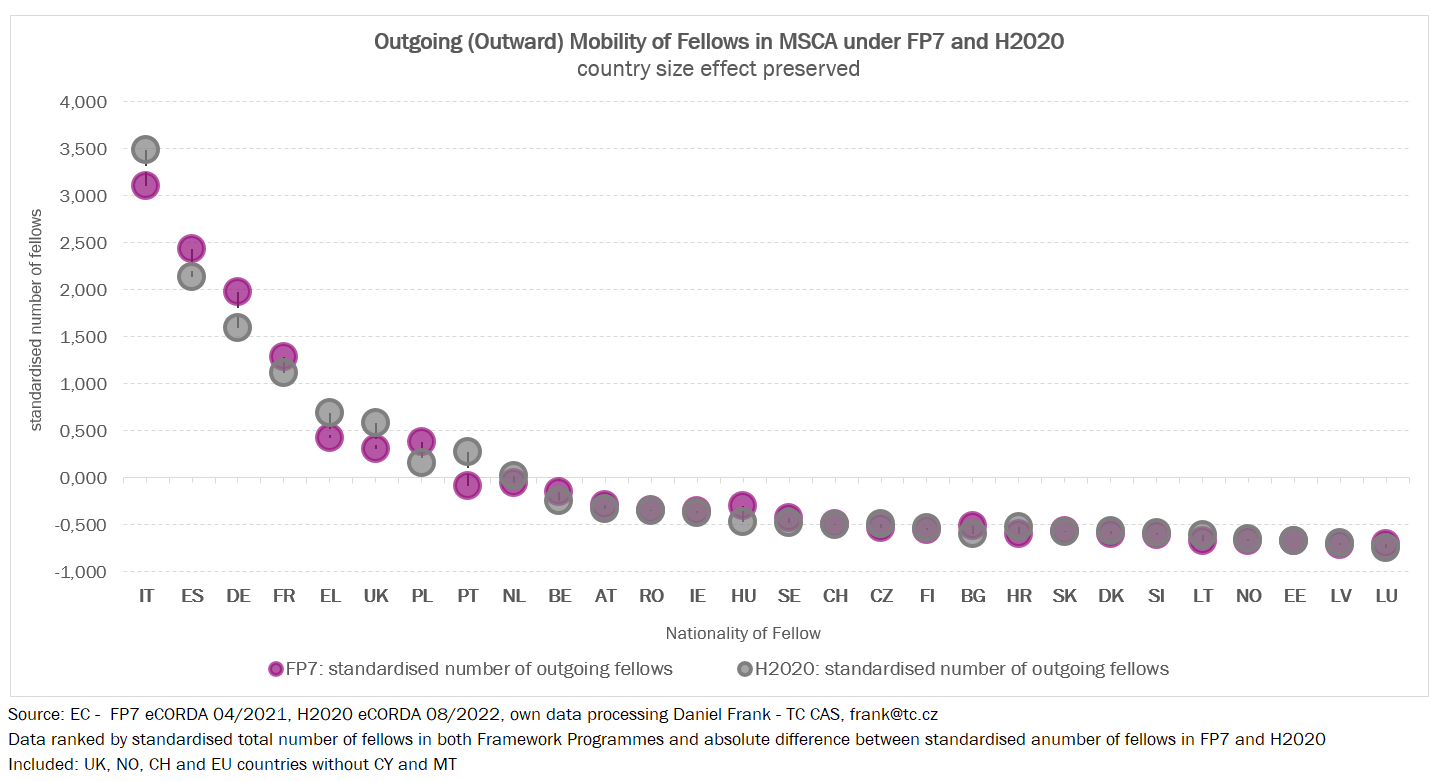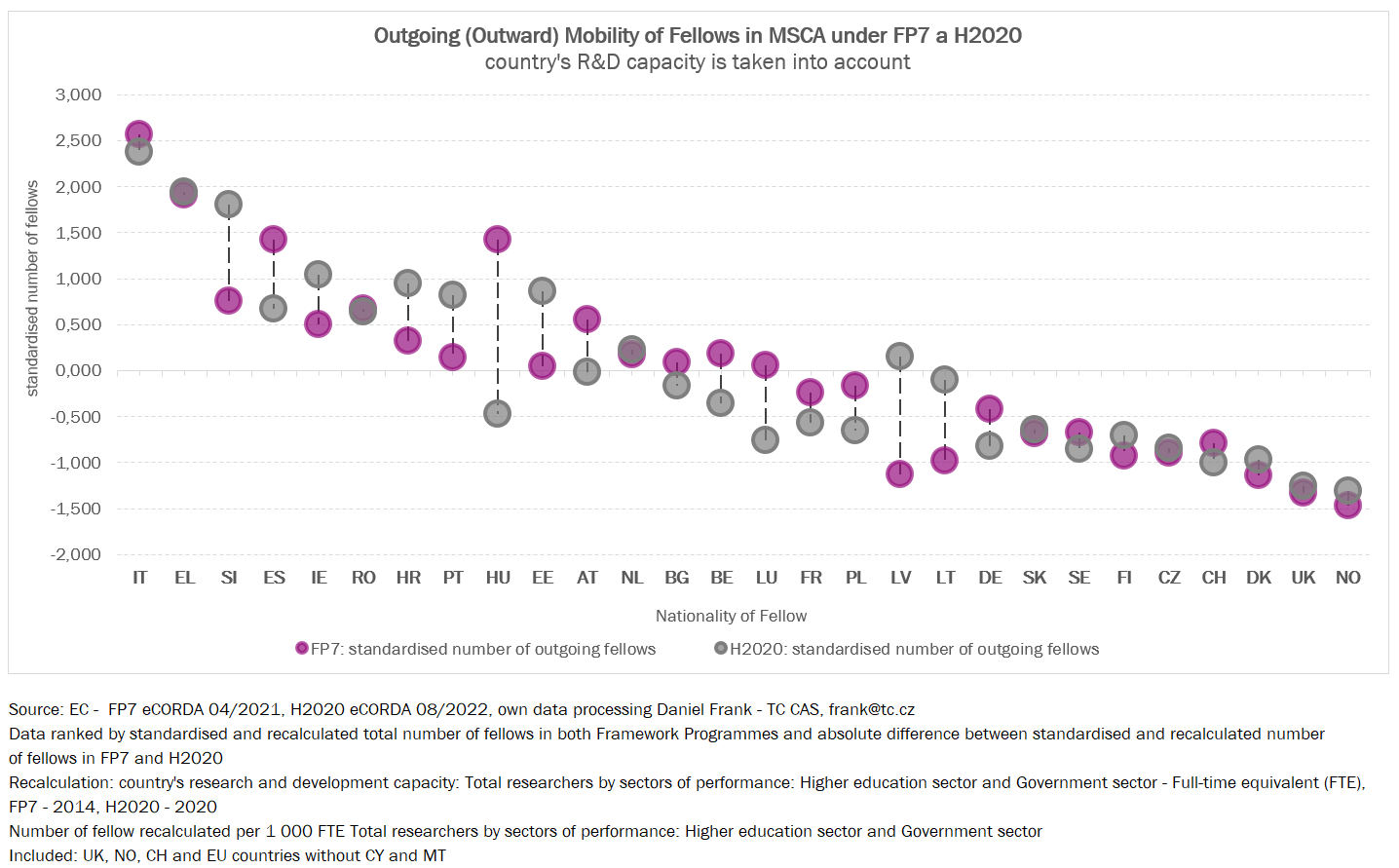 Pokud zohledníme výzkumnou kapacitu jednotlivých zemí (tj. počet FTE výzkumníků), ze kterých vyjíždějí stážisté dané národnosti do zahraničních výzkumných destinací, zjistíme, že nejaktivnější jsou Italové, Řekové, Slovinci, Španělé, Irové, Rumuni, Chorvati, Portugalci a Maďaři. U Slovinců, Irů, Chorvatů, Portugalců, Estonců, Litevců a Lotyšů je zaznamenána výraznější mobilita směrem do zahraničí v programu H2020 v porovnání se 7. RP. Naopak u Španělů, Maďarů, Rakušanů, Belgičanů, Lucemburčanů, Poláků a Němců pozorujeme opačný trend. Bilance českých výzkumníků putujících za řešením projektu MSCA z ČR do zahraničí zůstává dlouhodobě neměnná a počet vyjíždějících výzkumníků je vzhledem k výzkumné kapacitě ČR v obou RP velmi nízký. Čeští výzkumníci vyjíždějí do zahraničních výzkumných institucí přibližně ve stejném počtu (po přepočtu počtu vyjíždějících stážistů MSCA na počet FTE výzkumníků) jako Švédové, Finové, Švýcaři, Dáni, Norové či výzkumníci ze Spojeného království. Tento fakt však nelze v souvislosti s ČR vnímat jako pozitivní skutečnost, neboť země, ze kterých tito stážisté MSCA pocházejí, mají v porovnání s ČR daleko vyšší výzkumnou a inovační výkonnost a disponují velmi kvalitní personální výzkumnou základnou. Pro ČR jako výzkumně slabší zemi (dle EIS 2009 až 2021 moderate innovator) by bylo mnohem optimálnější využívat nástroje MSCA k výjezdu českých výzkumníků do zahraničí s mnohem vyšší intenzitou a úspěšností.