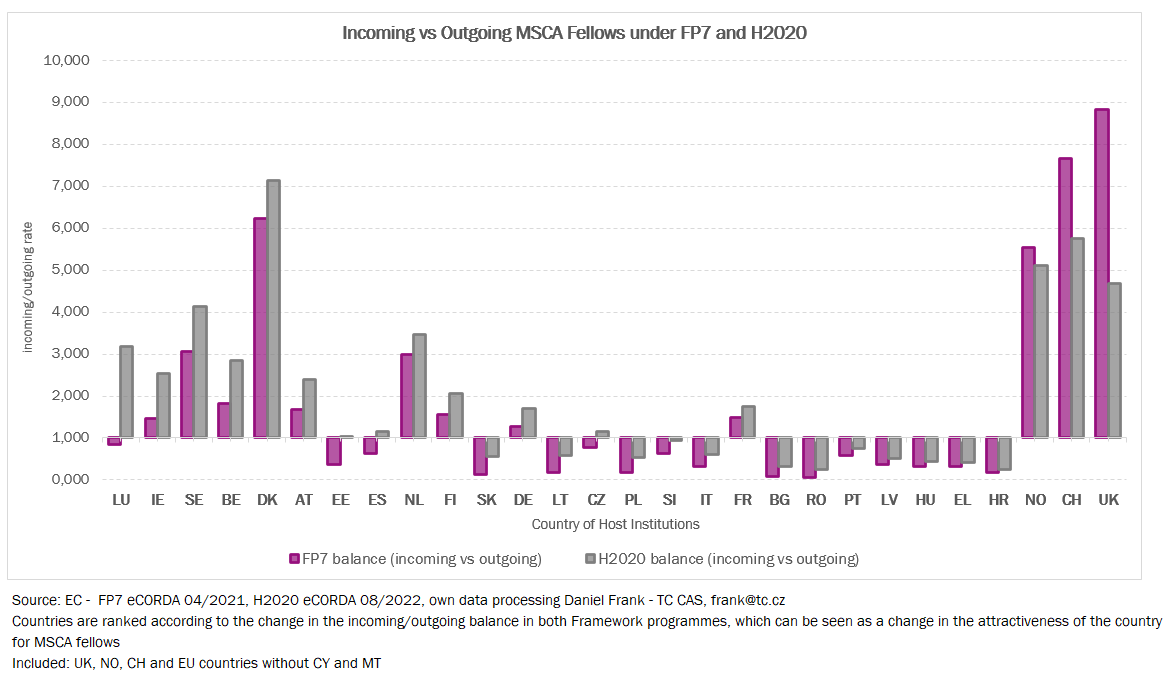 Následující graf prezentuje celkovou bilanci příchozí a odchozí mobility v jednotlivých zemích EU. Je patrné, že se Lucembursko, Irsko, Švédsko, Belgie, Rakousko a Dánsko staly v průběhu času pro stážisty MSCA atraktivnějšími hostitelskými zeměmi. Naopak Norsko, Švýcarsko a Spojené království na atraktivitě pro zahraniční výzkumníky poněkud ztratily. V případě ČR v 7. RP mírně převažují odchozí výzkumníci, v H2020 je tomu naopak a mírně převažují stážisté směřující do ČR. Poměr příchozích a odchozích výzkumníků tak v případě ČR v obou RP konverguje k poměru 1:1. V programu H2020 dokonce natolik, že může bilanci příchozích a odchozích výzkumníků považovat za téměř vyrovnanou. Viz také přiložené kartogramy.