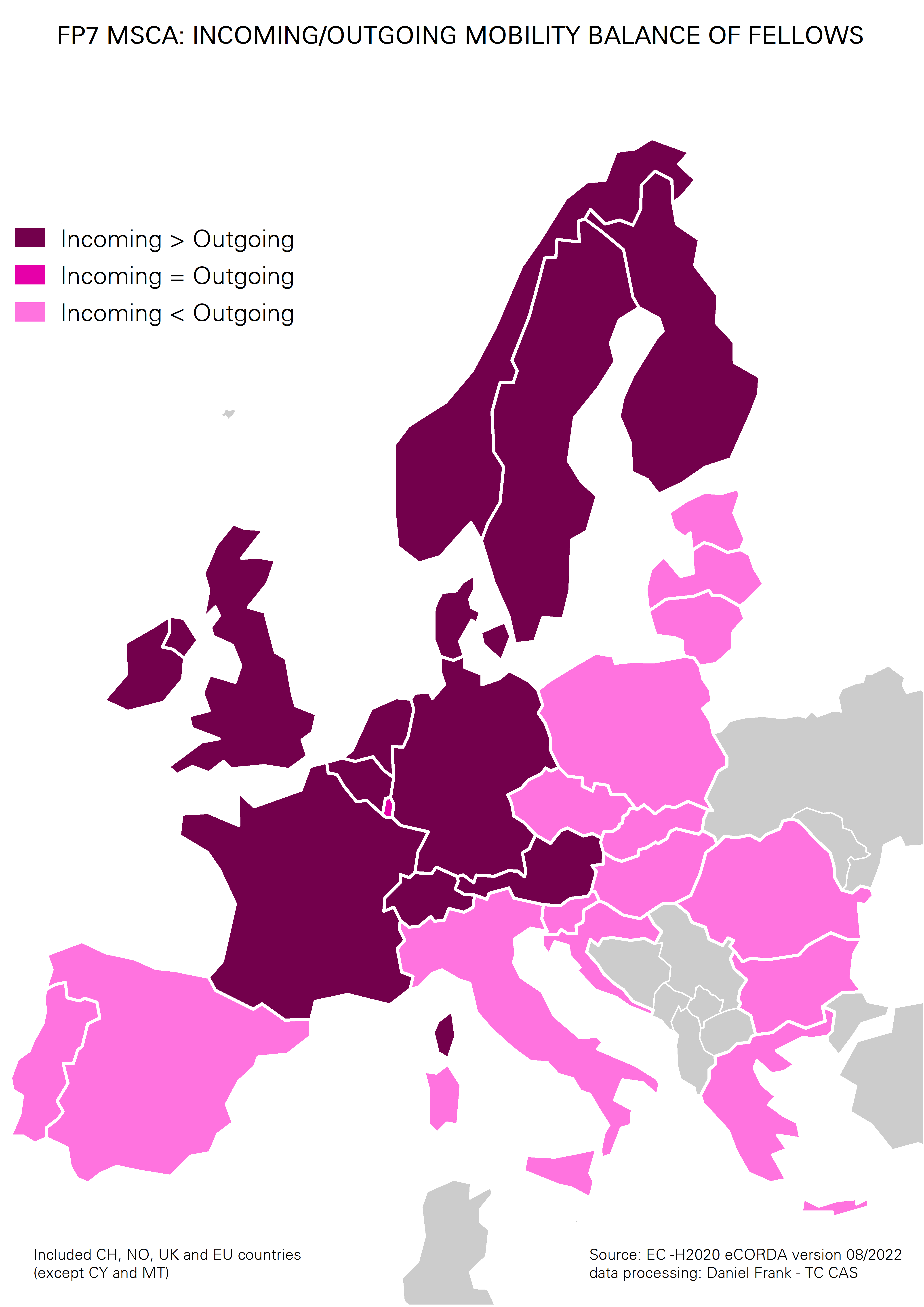 Zjednodušující a ilustrativní pohled na mobilitu v prioritě MSCA v 7. RP a programu H2020 přinášejí níže uvedené kartogramy. Pro program H2020 platí, že z analyzovaných zemí mají pouze ČR, Španělsko, Slovinsko a Estonsko relativně vyrovnanou bilanci příchozích a odchozích stážistů MSCA. Pro země EU-14 a Spojené království, Norsko a Švýcarsko je typické, že převažují příchozí zahraniční stážisté před stážisty dané národnosti, kteří z těchto zemí odcházejí řešit projekt MSCA do zahraničí. Naopak pro většinu zemí EU-13 je charakteristická výrazná převaha odchozích výzkumníků před příchozími řešiteli projektů MSCA ze zahraničí.