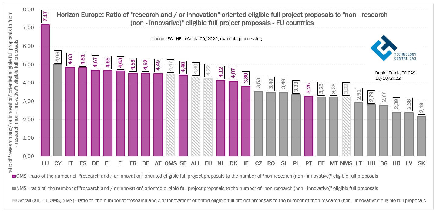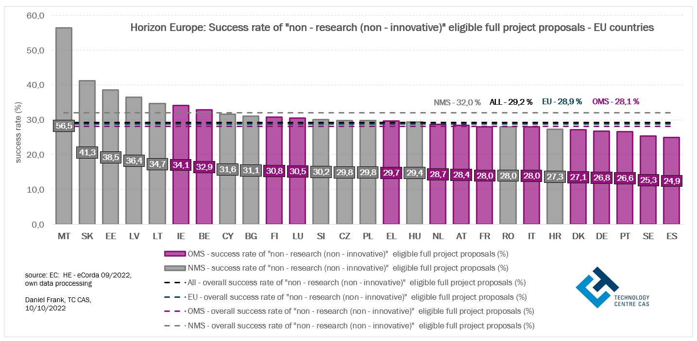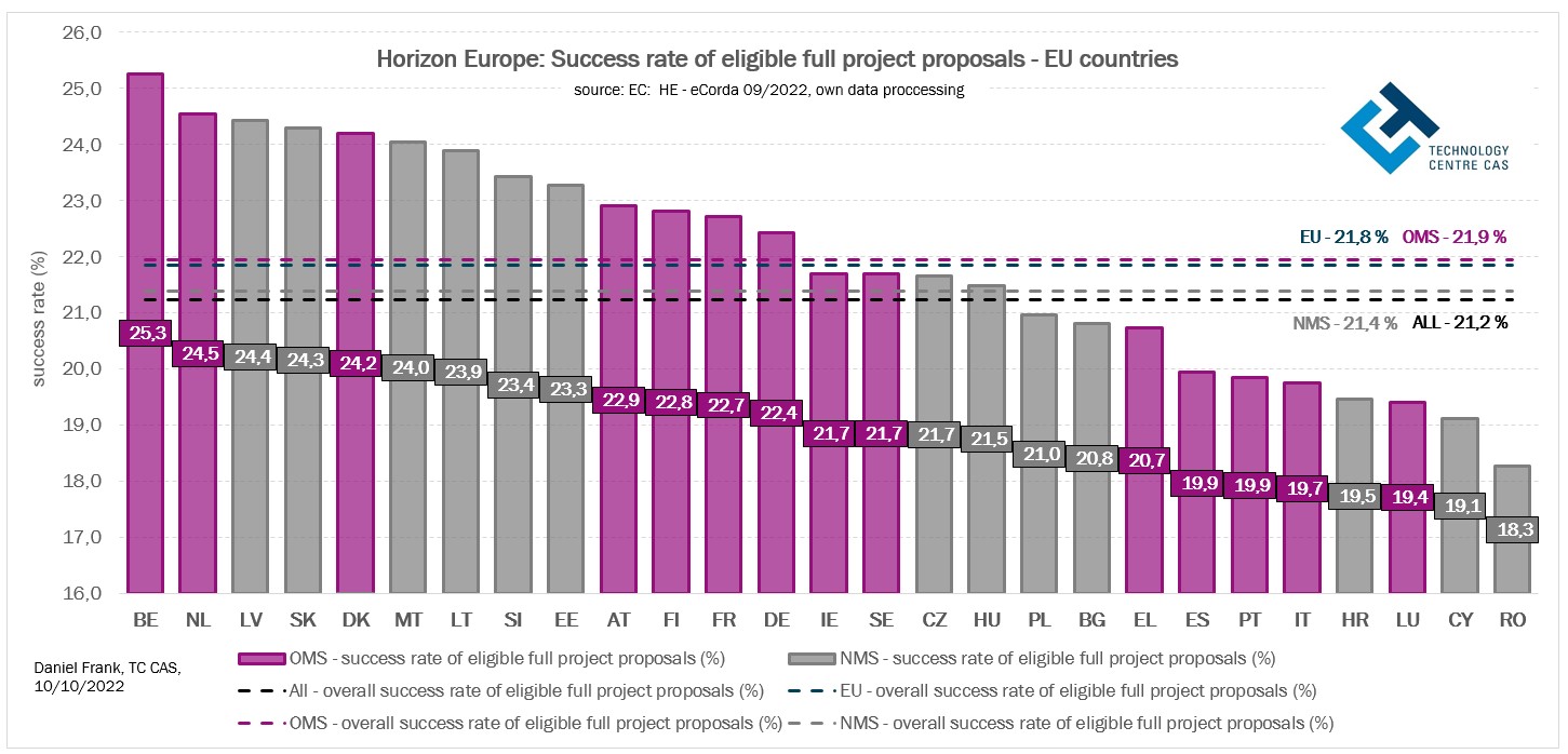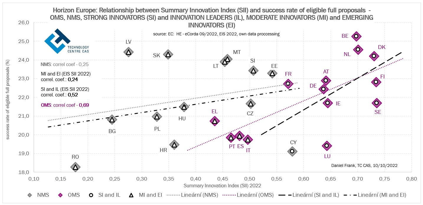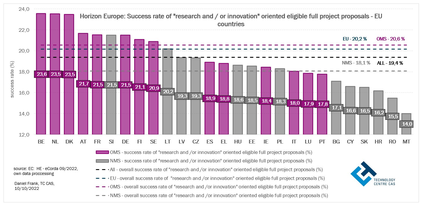 Je zřejmé, že úspěšnost návrhů projektů je u řady zemí EU-13 ovlivněna vysokým podílem úspěšných návrhů projektů, které nemají čistě výzkumný a (nebo) inovační charakter. To vysvětluje postavení Lotyšska nebo Slovenska mezi ostatními státy při posuzování celkové úspěšnosti projektových návrhů v programu Horizont Evropa. U starých členských států (EU-14, SČS) nebo států s vyšším inovačním potenciálem, kde se úspěšné, tj. financované projekty věnují spíše vědě a inovacím, hodnoty celkové úspěšnosti těchto států v programu H2020 mohou souviset s vyšším inovačním indexem těchto států. Výsledná úspěšnost projektových návrhů zemí EU v programu Horizont Evropa je do značné míry odrazem jejich inovační výkonnosti nebo naopak schopnosti a míry zapojení se do financovaných projektů zaměřených na koordinační, podpůrné, školící, informační a networkingové aktivity.