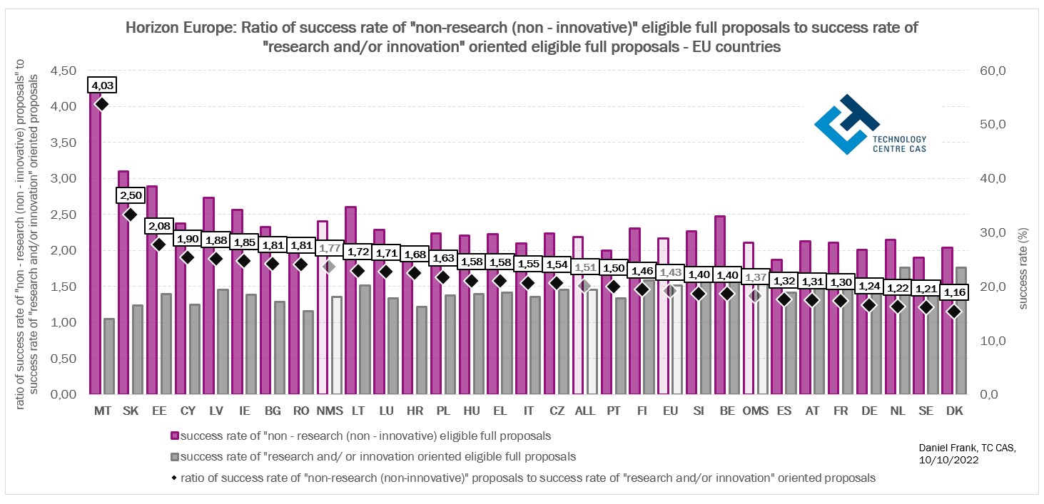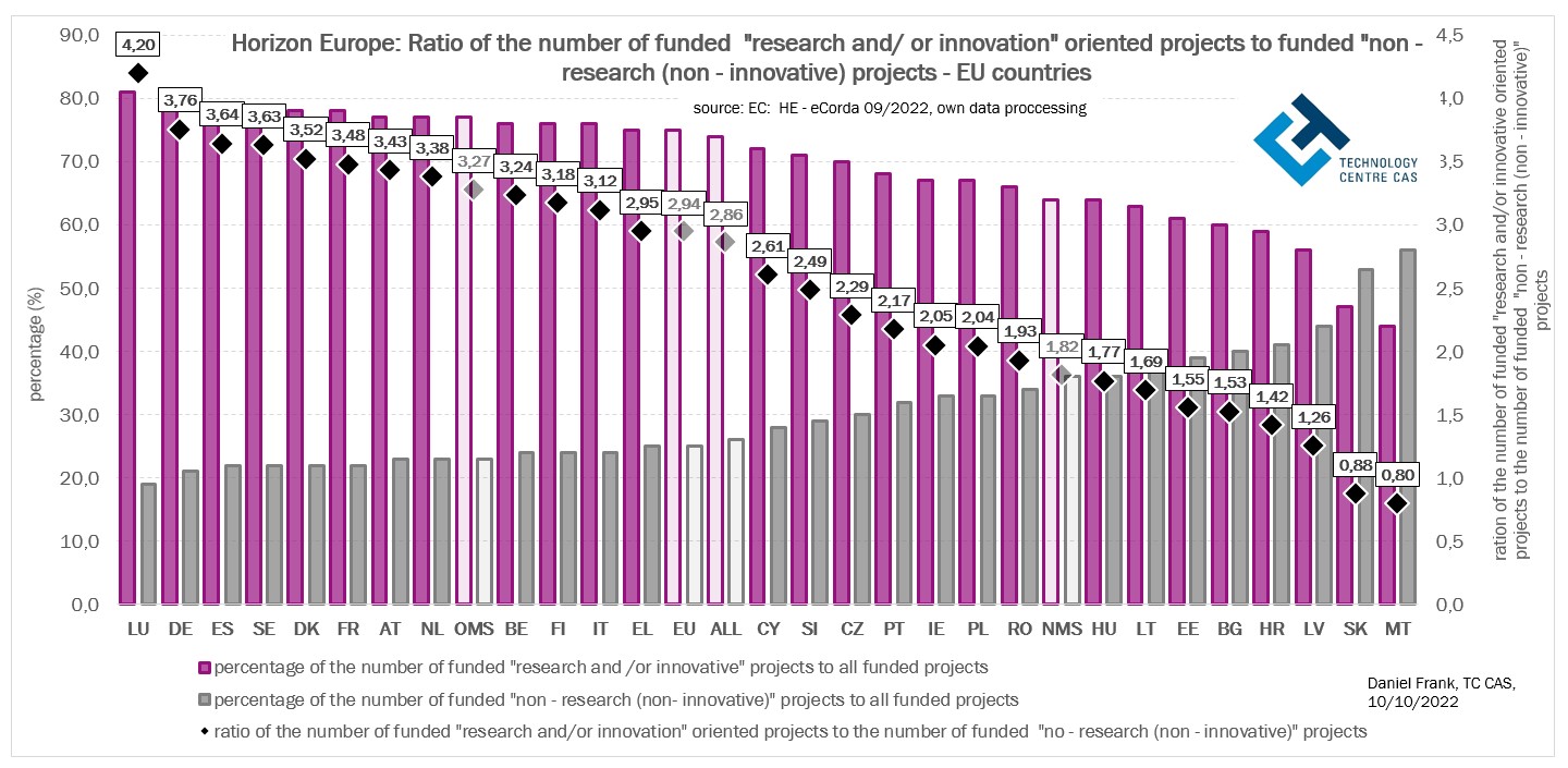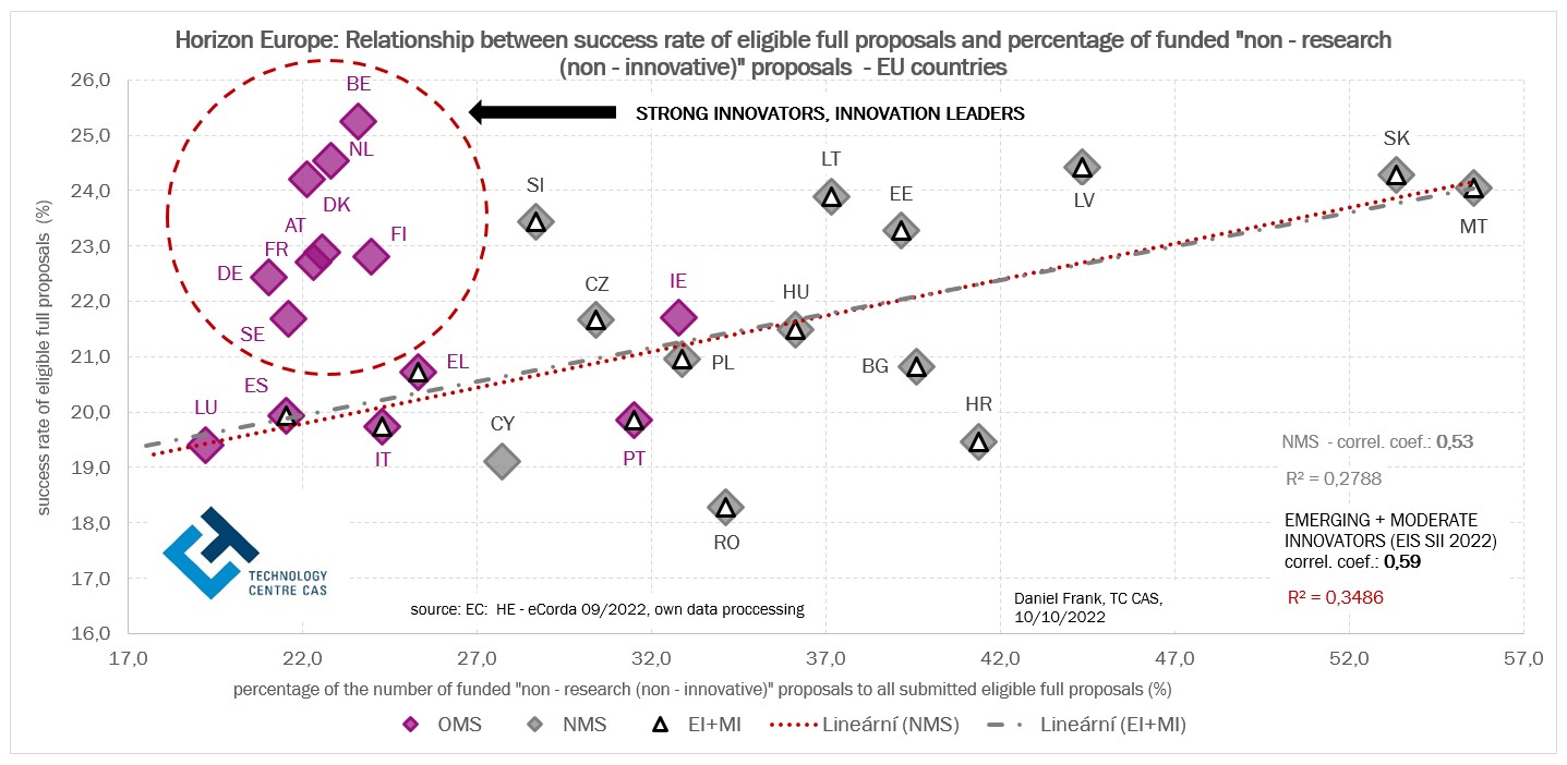 Čím je podíl financovaných nevýzkumných (neinovačních) projektových návrhů (tj. nevědeckých – neinovačních financovaných projektů) s účastí daného státu vyšší, tím vyšší je celková úspěšnost tohoto státu v programu Horizont Evropa. Jinými slovy řečeno velikost podílu financovaných projektů, jejichž obsahem není věda a inovace, nýbrž jiné aktivity má výrazný vliv ne celkovou úspěšnost v programu Horizont Evropa. Toto se týká zejména států EU-13.