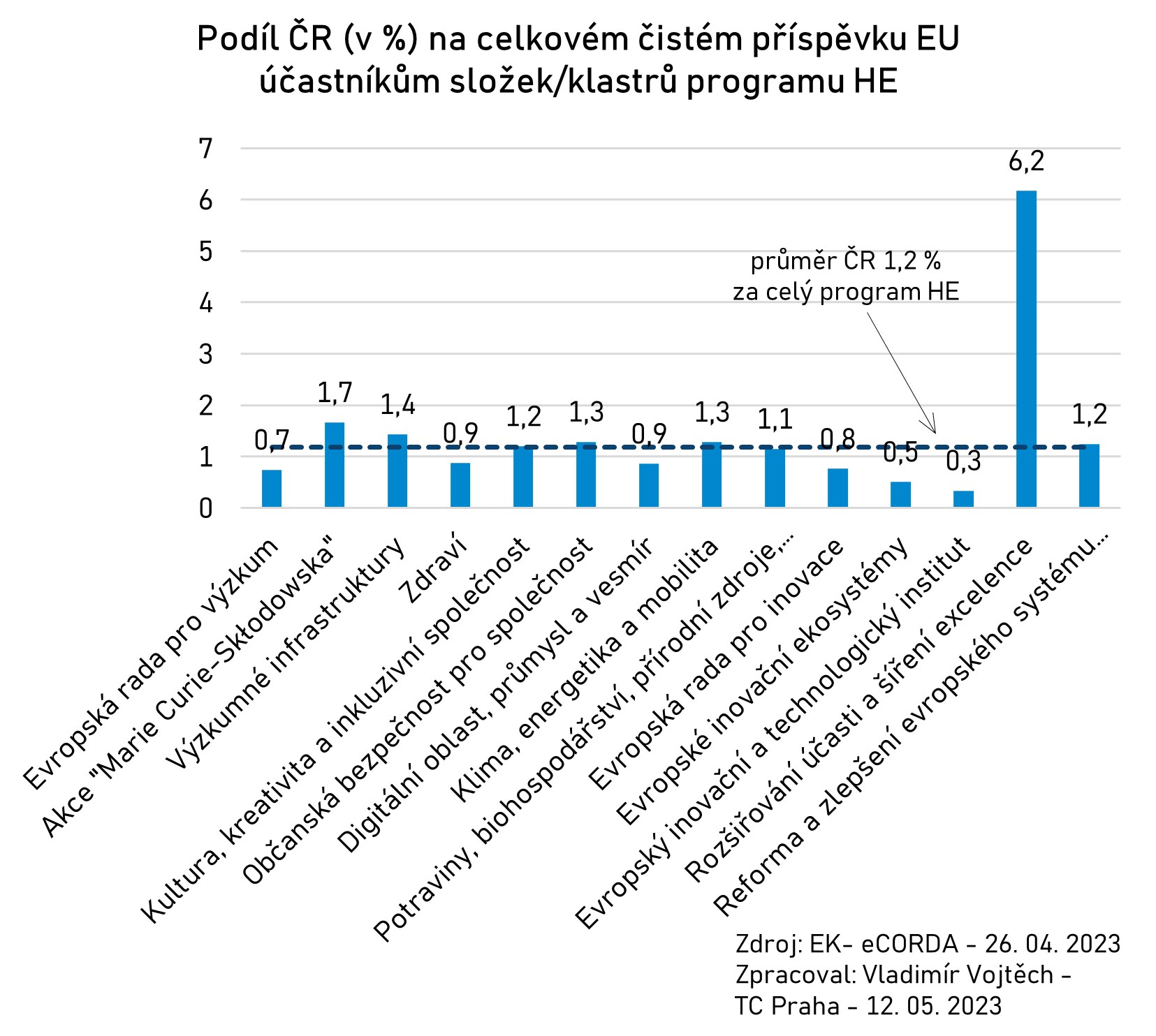 Ve srovnání s programem HE jako celkem čeští účastníci vykazují nižší čistý příspěvek EU v I., II. a zejména III. pilíři. Naopak sekce Rozšiřování účasti a posilování Evropského výzkumného prostoru se tuzemské subjekty účastní nadprůměrně.