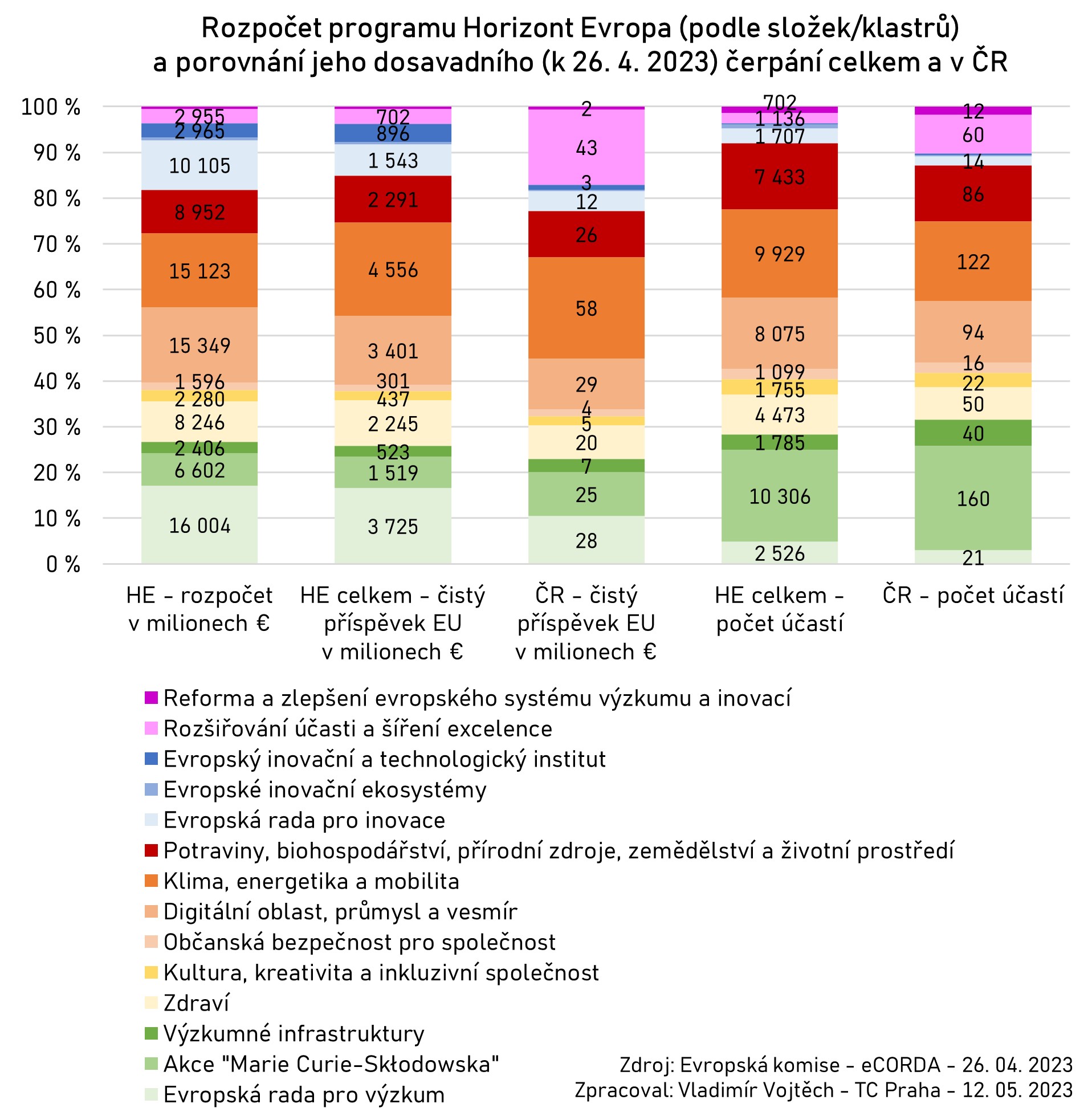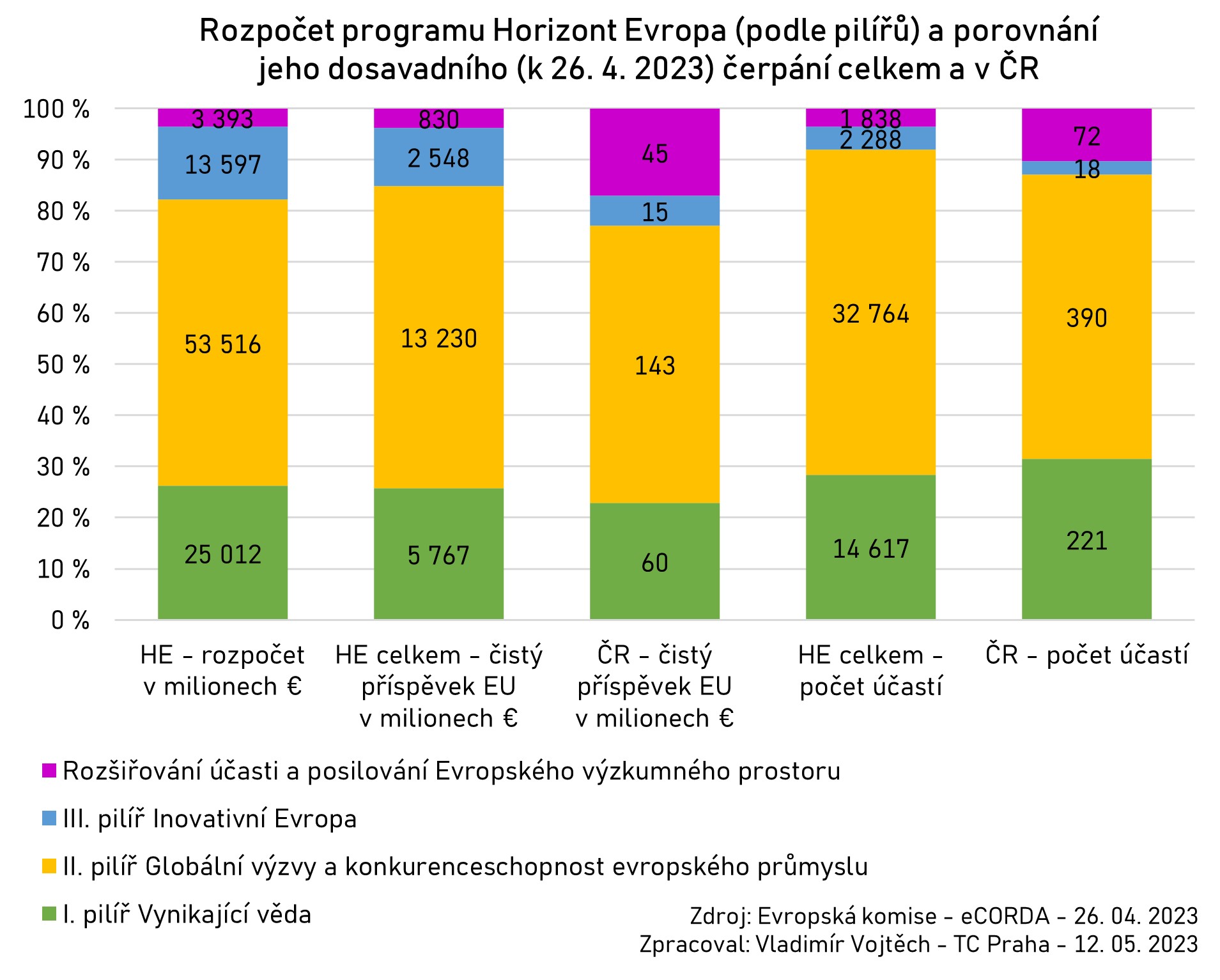 Rakouská společnost na podporu výzkumu (FFG) ve své zprávě o účasti Rakouska v programu Horizont Evropa (dále jen „HE“) z února 2023 porovnává na úrovni jednotlivých pilířů plánovaný rozpočet programu HE a jeho dosavadní čerpání za celý program (s. 5). Účast rakouských subjektů je porovnávána na úrovni pilířů (s. 6) i na úrovni jednotlivých složek, resp. klastrů programu HE (s. 7 a 8). Podívejme se proto, jak si k 26. dubnu 2023 v obdobném srovnání stojí Česká republika, a zároveň navažme na příspěvek z 8. května 2023, který v základních obrysech prezentuje dosavadní působení ČR v programu HE.