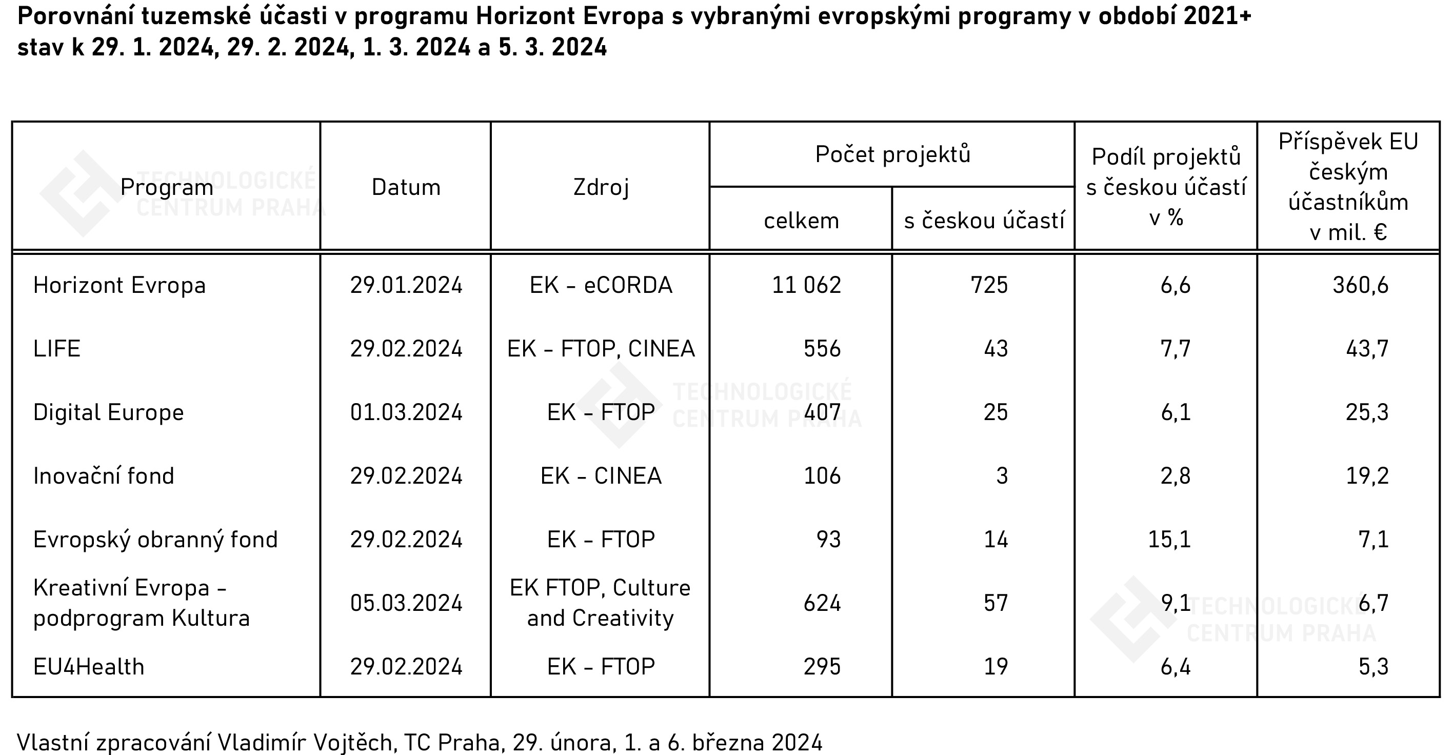 Tuzemské subjekty se účastní zhruba 6,5 % projektů v programu Horizont Evropa, který mezi evropskými výzkumnými programy vyniká. Rovněž u menších programů LIFE, Digital Europe a EU4Health se tuzemské subjekty účastní podobnou měrou. Podprůměrně se tuzemské subjekty účastní Inovačního fondu. Naopak v Evropském obranném fondu a podprogramu Kultura Kreativní Evropy je tuzemská účast nadprůměrná.