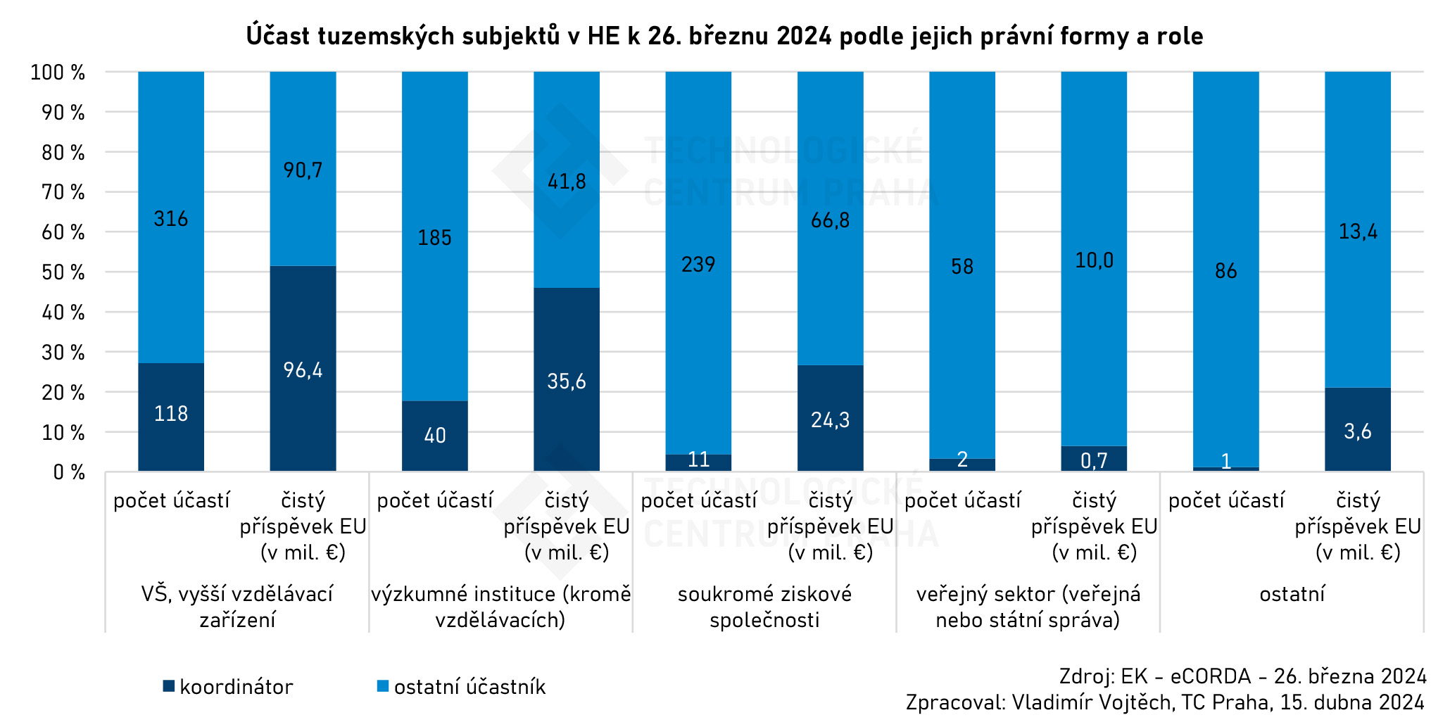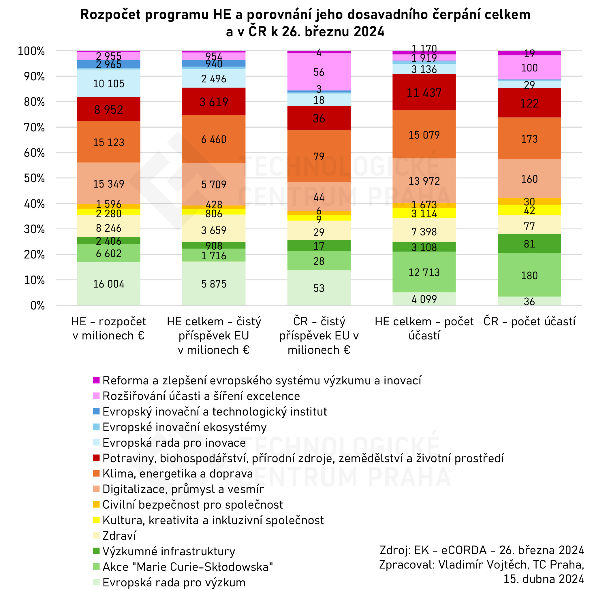 K 26. březnu 2024 databáze Evropské komise eCORDA evidovala pro Českou republiku 1 056 financovaných účastí v 768 projektech programu Horizont Evropa (dále jen „HE“). K témuž datu tuzemští účastníci nárokovali čistý příspěvek EU ve výši 383 milionů €. Mezi členskými zeměmi EU a k programu HE přidruženými zeměmi si ČR dlouhodobě udržuje 17. pozici, a to jak z hlediska počtu účastí, tak z hlediska čistého příspěvku EU. Pro srovnání: Polsko je dlouhodobě v obou ukazatelích 16. (1 349 účastí s čistým příspěvkem EU 474 mil. €), Slovinsko je v účasti 19. (868 účastí) a v čistém příspěvku EU 18. (282 mil. €). Pořadí ČR, ale i Polska či Slovinska, zcela odpovídá celkové ekonomické výkonnosti těchto zemí – v ukazateli HDP na obyvatele v paritě kupní síly byla ČR v r. 2022 (podle údajů Světové banky) mezi členskými zeměmi EU a k programu HE přidruženými zeměmi 18., Slovinsko 19.
