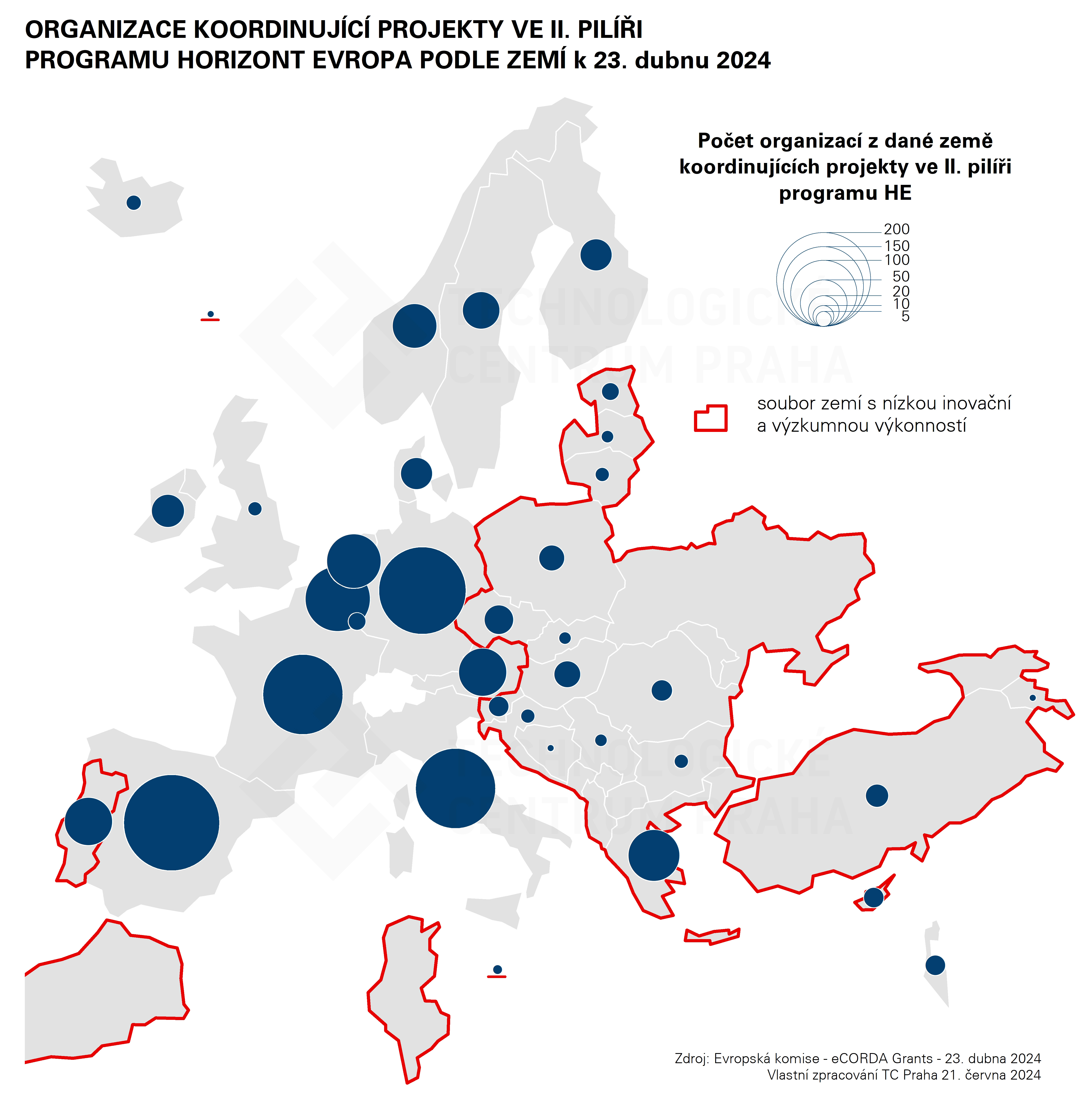 K 23. dubnu 2024 databáze Evropské komise eCORDA evidovala v II. pilíři „Globální výzvy a konkurenceschopnost evropského průmyslu“ 3,4 tis. projektů (s 53,8 tis. evidovanými účastmi), které byly koordinovány 1,3 tis. organizacemi. Výlučně s II. pilířem pracujeme proto, že tematicky řeší hlavní environmentální, společenské a hospodářské výzvy, jimž současná EU čelí a k jejichž řešení se výzkumná konsorcia snaží přispět. Celkový čistý příspěvek EU účastníkům projektů ve II. pilíři dosahoval 21 mld. €, v tom koordinující instituce nárokovaly 4,1 mld. €. Nejvíce koordinujících organizací vykázalo Španělsko (212 organizací koordinujících 542 projektů), Německo (175 organizací koord. 395 projektů), Itálie (148 organizací koord. 370 projektů) a Francie (147 organizací koord. 305 projektů) (viz kartodiagram).