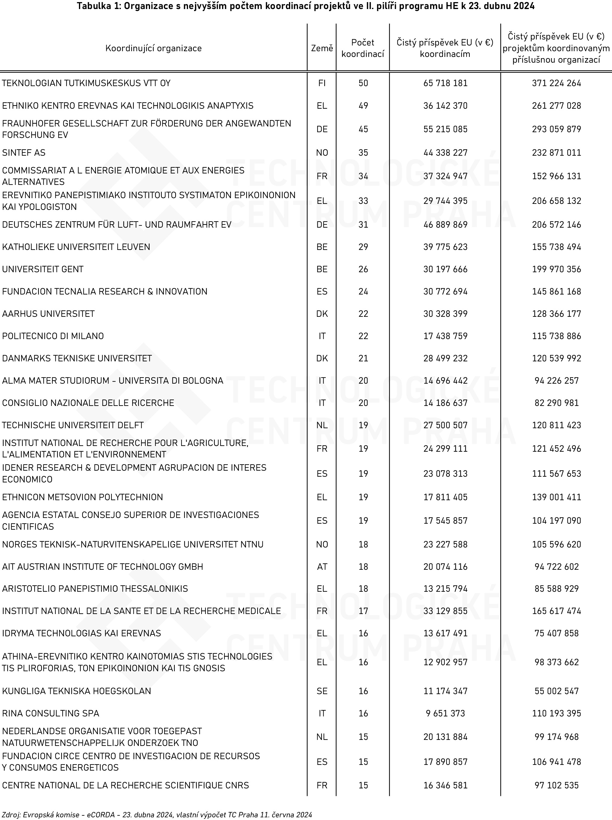 15 a více projektových koordinací vykázalo 31 evropských organizací. Koordinace projektů ve II. pilíři těmto organizacím celkem přinášela 823 milionů € (tabulka 1). Celková hodnota projektů, jež těchto 31 organizací koordinuje, v ukazateli čistého příspěvku EU dosahuje 4,5 mld. €. Tyto organizace nejčastěji pocházely z Řecka (6 organizací koordinujících 151 projekt). Po 4 organizacích vykázaly Francie (85 koordinací), Itálie (78 koordinací) a Španělsko (77 koordinací). Cílem příspěvku je zjistit, do jaké míry s uvedenými předními 31 organizacemi spolupracují v rámci programu Horizont Evropa tuzemské organizace.