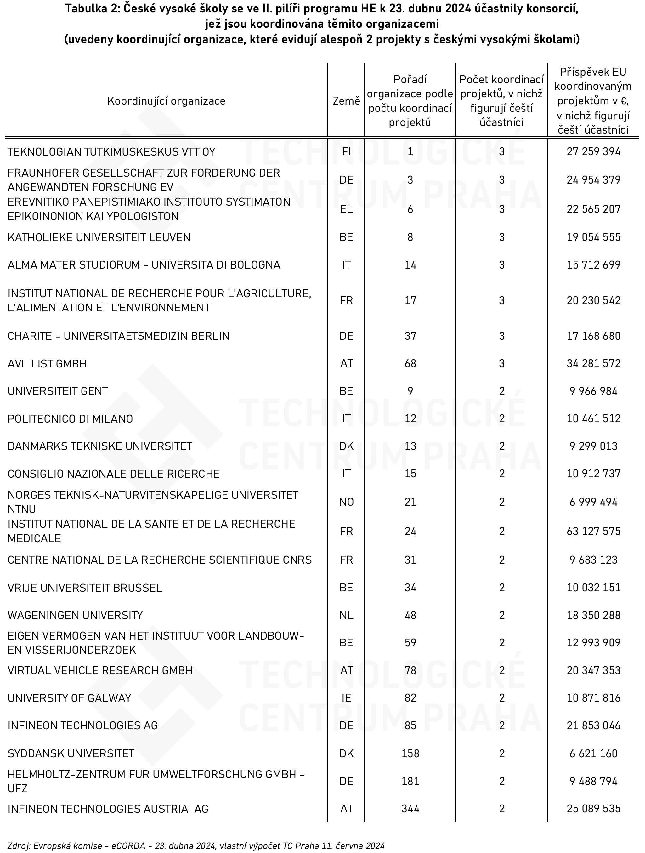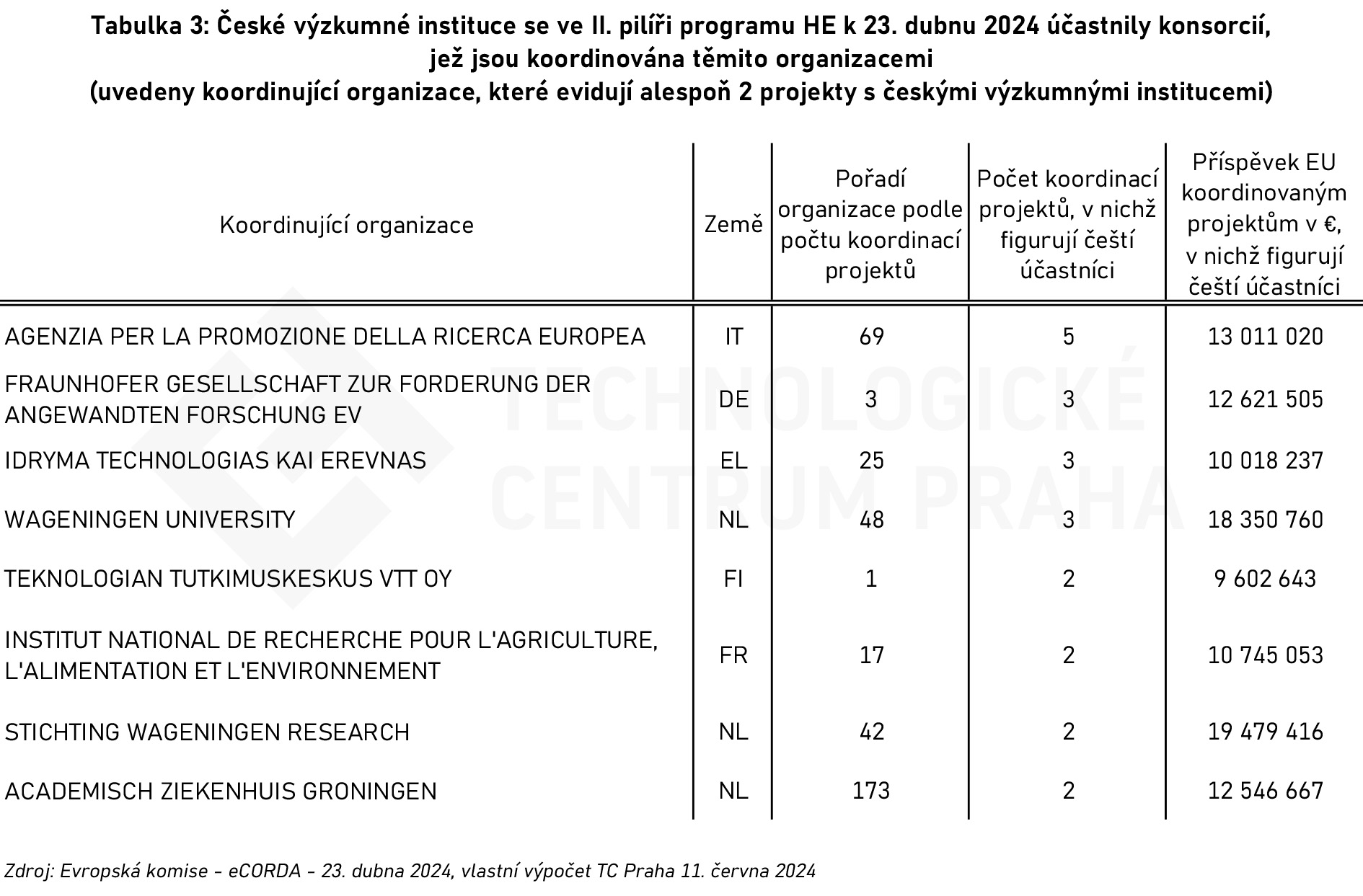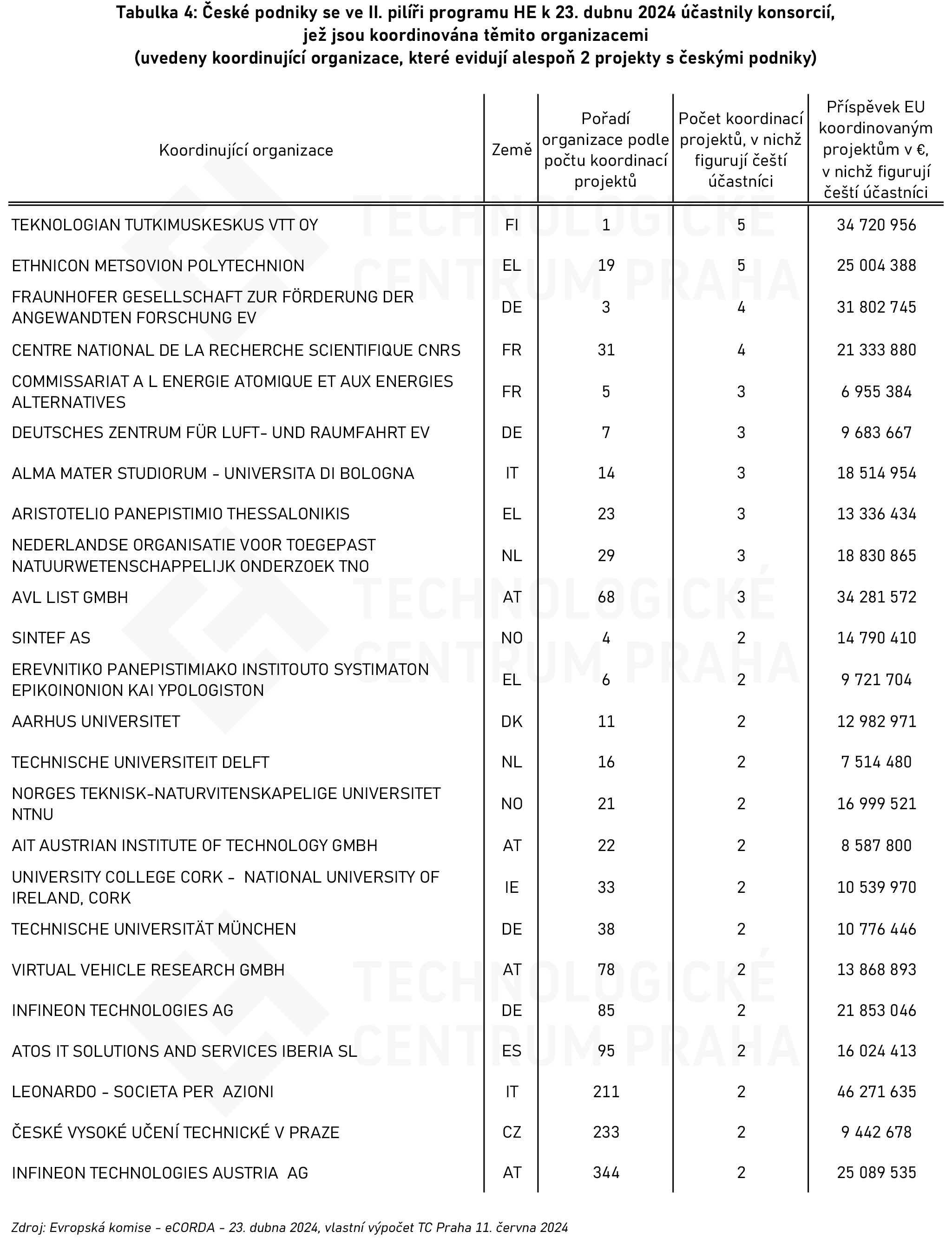Co se týká konkrétních organizací, pak 14 koordinátorů mělo ve 2 projektech zastoupený český podnik (tabulka 4). Dalších 6 koordinátorů mělo český podnik zastoupený ve 3 projektech. Mezi ně patří např. Univerzita v Boloni nebo Německé centrum pro letectví a vesmír (DLR). Čtyři koordinátoři pak měli český podnik zastoupen ve 4 nebo 5 projektech. To je případ finského Technologického výzkumného střediska VTT nebo německé Fraunhoferovy společnosti pro podporu aplikovaného výzkumu – tedy institucí, které vykázaly 1. a 3. nejvyšší počet koordinací projektů ve II. pilíři programu HE. Z uváděných 24 koordinátorů (tabulka 4) jich 15 patřilo mezi 31 organizací s nejvyšším počtem koordinací.