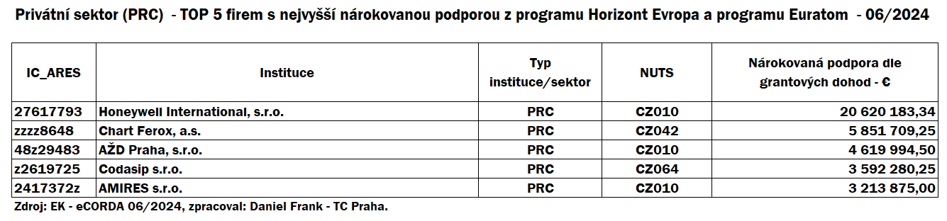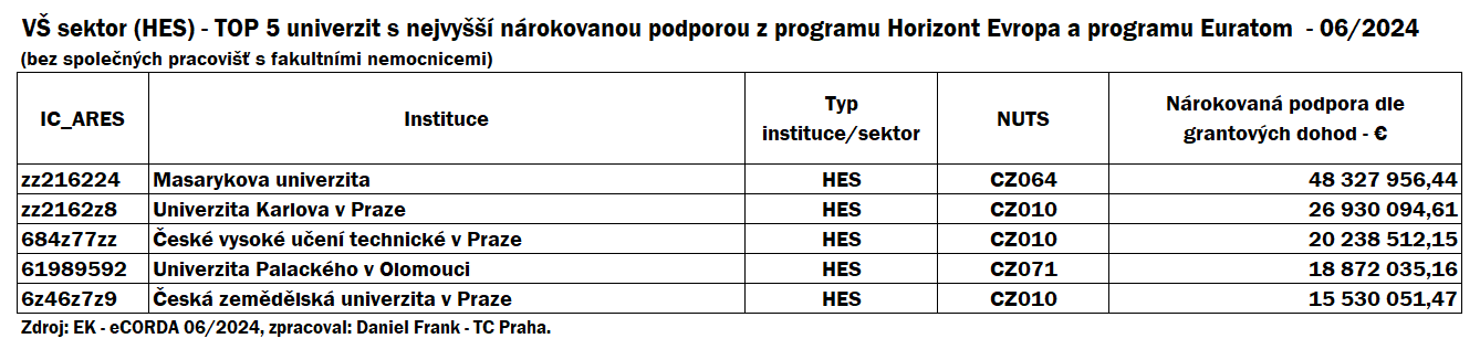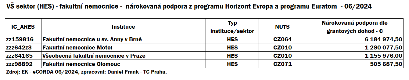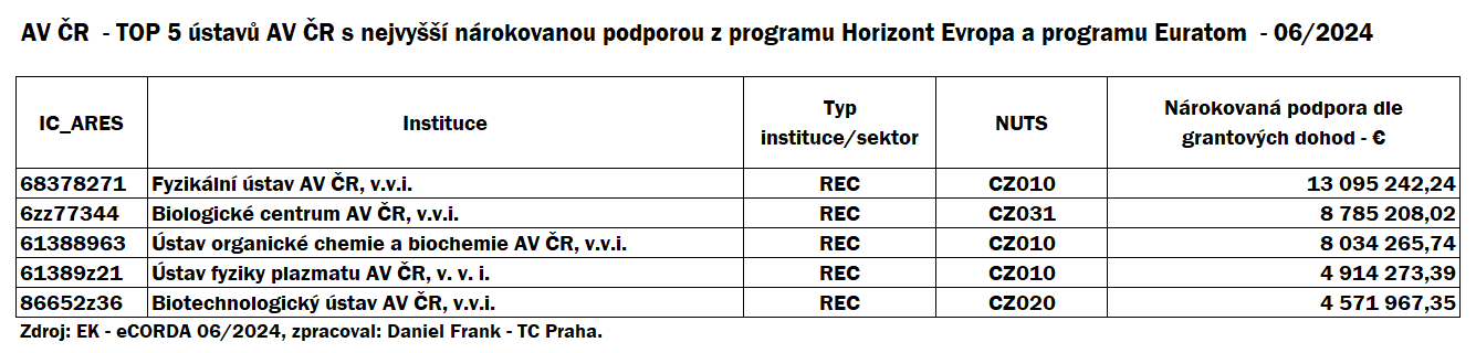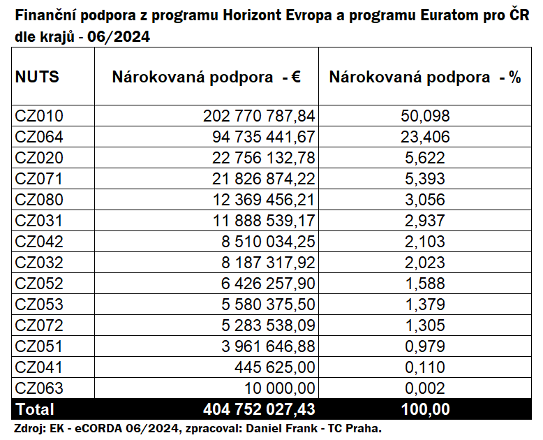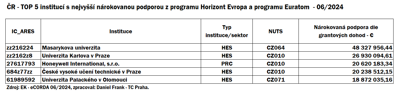 ČR si v dosavadním průběhu programu Horizont Evropa a programu Euratom nárokuje 405 mil. €. Více než polovina těchto prostředků míří do Prahy - 203 mil. €. Necelá čtvrtina nárokované podpory pro ČR putuje do Jihomoravského kraje - 95 mil. €. Největšími příjemci finančních prostředků jsou v ČR: Masarykova univerzita v Brně, Univerzita Karlova v Praze, firma Honeywell International, s. r. o., České vysoké učení v Praze a Univerzita Palackého v Olomouci. Mezi ústavy AV ČR je nejúspěšnější Fyzikální ústav AV ČR, v. v. i.