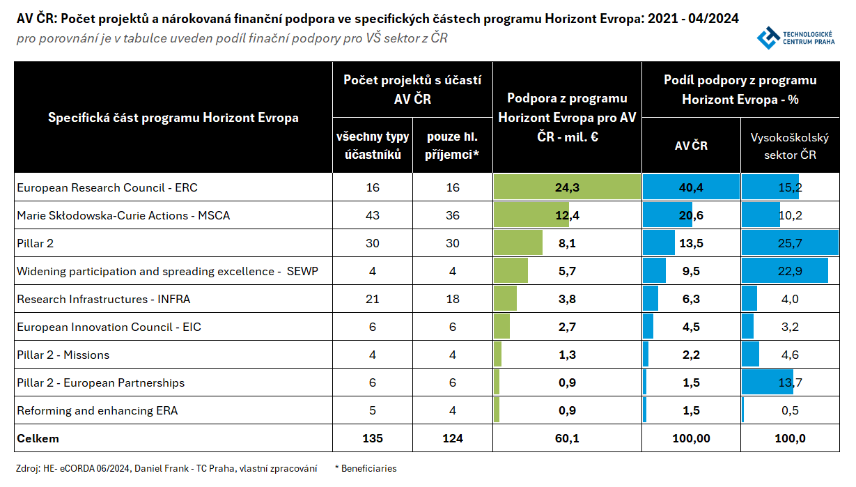 Celková dosud nárokovaná podpora pro AV ČR z rozpočtu programu HE činí 60,1 mil. € (data k 06/2024). Tuto částku lze rozdělit do devíti stanovených specifických oblastí programu HE. Výsledek rozdělení finanční podpory AV ČR je prezentován tabulkou 1.